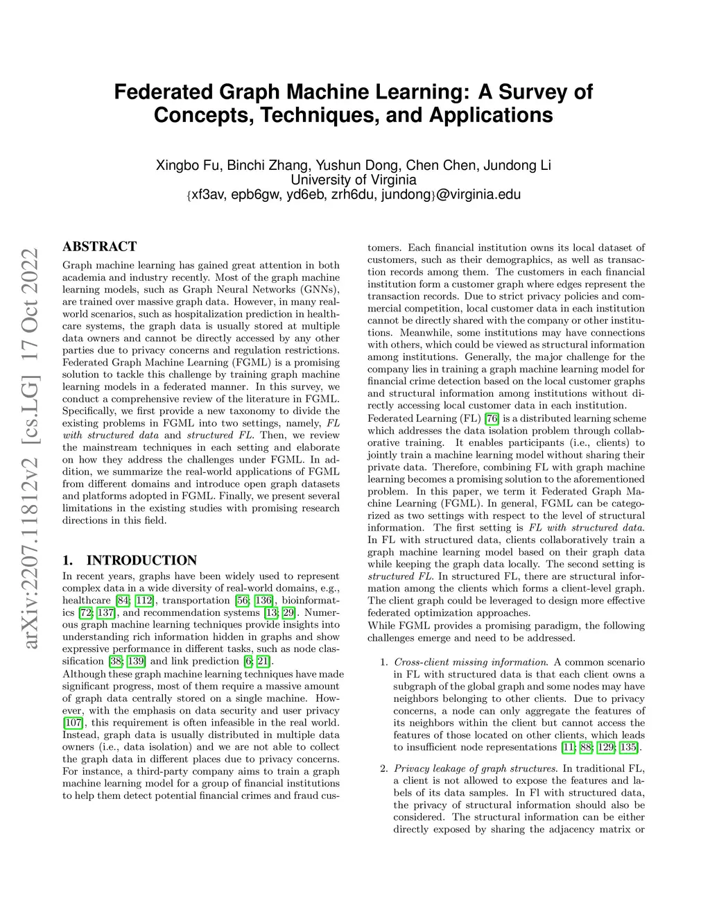 Graph machine learning has gained great attention in both academia and industry recently. Most of the graph machine learning models, such as Graph Neural Networks (GNNs), are trained over massive graph data. However, in many real-world scenarios, such as hospitalization prediction in healthcare systems, the graph data is usually stored at multiple data owners and cannot be directly accessed by any other parties due to privacy concerns and regulation restrictions. Federated Graph Machine Learning (FGML) is a promising solution to tackle this challenge by training graph machine learning models in a federated manner. In this survey, we conduct a comprehensive review of the literature in FGML. Specifically, we first provide a new taxonomy to divide the existing problems in FGML into two settings, namely, FL with structured data and structured FL. Then, we review the mainstream techniques in each setting and elaborate on how they address the challenges under FGML. In addition, we summarize the real-world applications of FGML from different domains and introduce open graph datasets and platforms adopted in FGML. Finally, we present several limitations in the existing studies with promising research directions in this field.