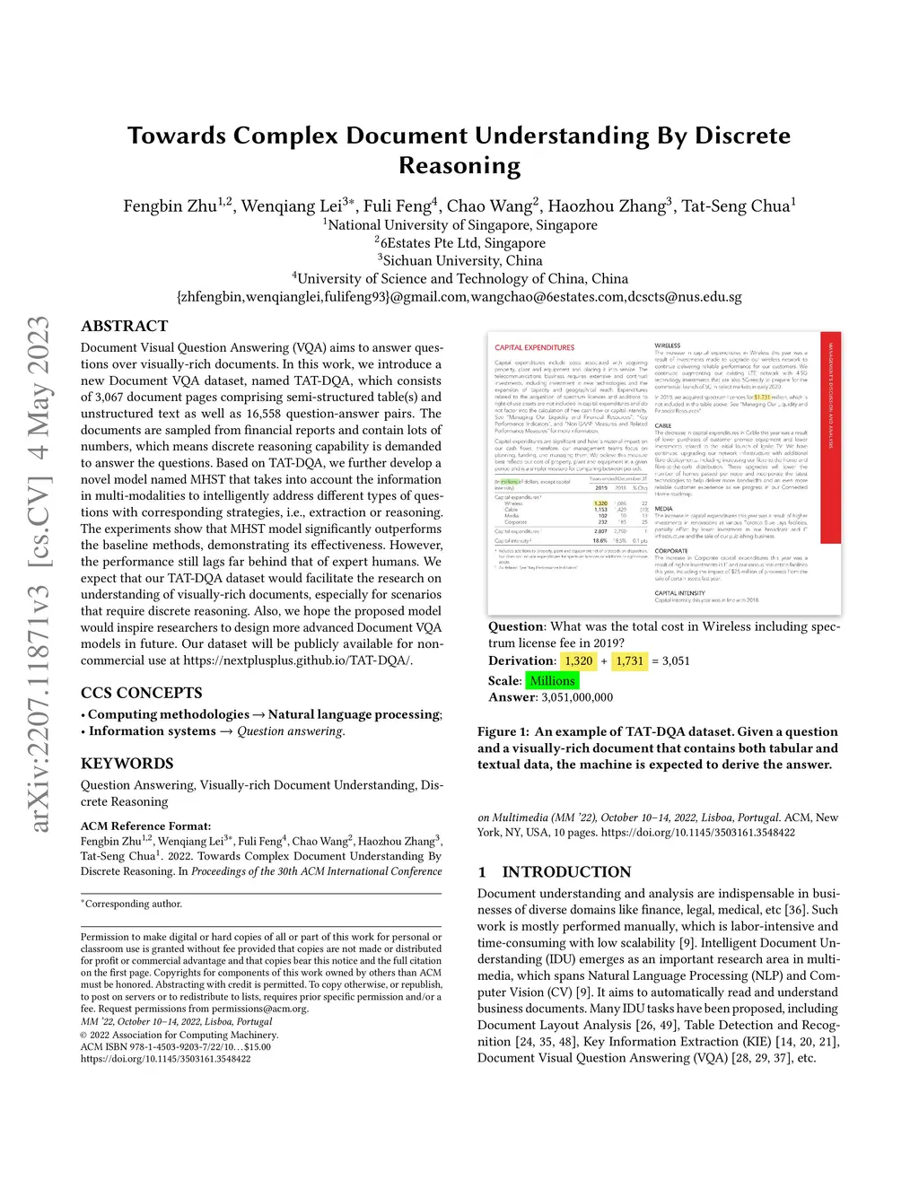 Document Visual Question Answering (VQA) aims to understand visually-rich documents to answer questions in natural language, which is an emerging research topic for both Natural Language Processing and Computer Vision. In this work, we introduce a new Document VQA dataset, named TAT-DQA, which consists of 3,067 document pages comprising semi-structured table(s) and unstructured text as well as 16,558 question-answer pairs by extending the TAT-QA dataset. These documents are sampled from real-world financial reports and contain lots of numbers, which means discrete reasoning capability is demanded to answer questions on this dataset. Based on TAT-DQA, we further develop a novel model named MHST that takes into account the information in multi-modalities, including text, layout and visual image, to intelligently address different types of questions with corresponding strategies, i.e., extraction or reasoning. Extensive experiments show that the MHST model significantly outperforms the baseline methods, demonstrating its effectiveness. However, the performance still lags far behind that of expert humans. We expect that our new TAT-DQA dataset would facilitate the research on deep understanding of visually-rich documents combining vision and language, especially for scenarios that require discrete reasoning. Also, we hope the proposed model would inspire researchers to design more advanced Document VQA models in future. Our dataset will be publicly available for non-commercial use at https://nextplusplus.github.io/TAT-DQA/.