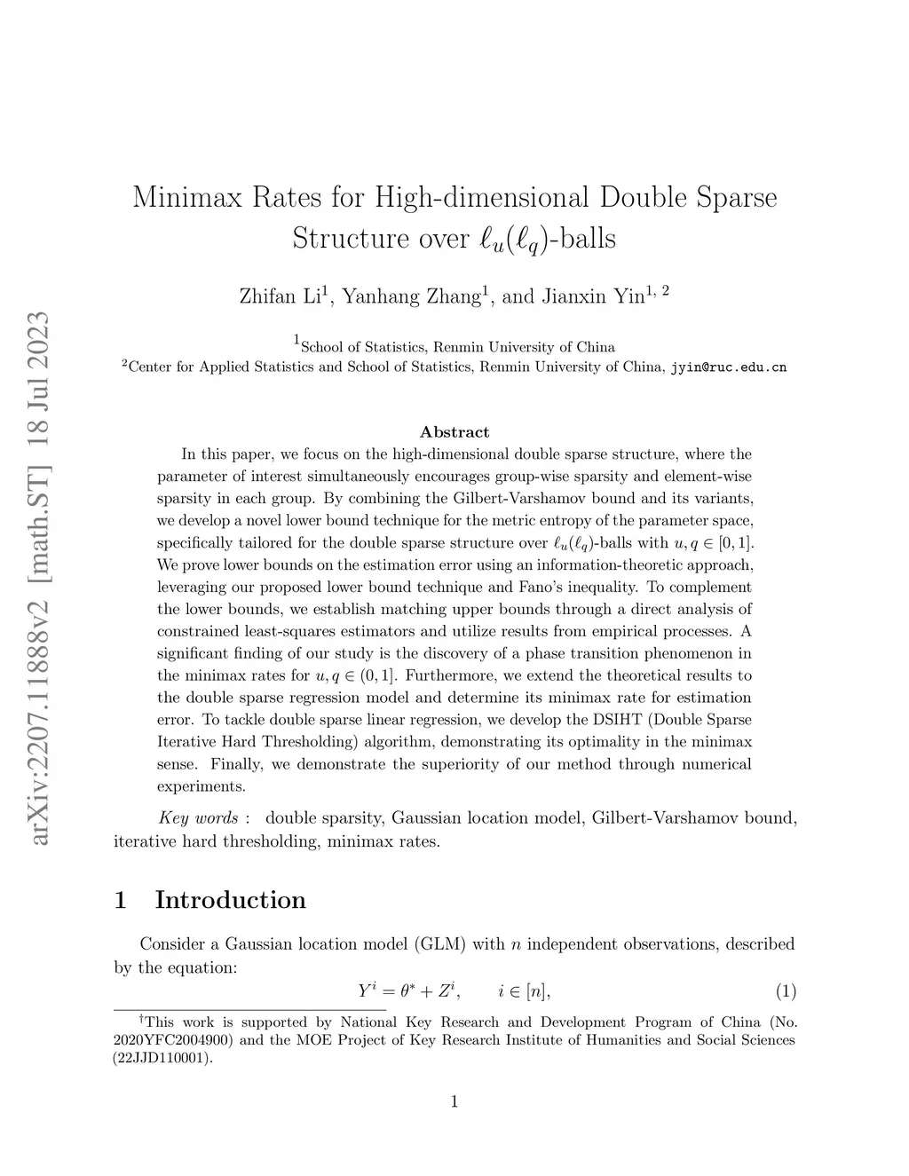 In this paper, we focus on the high-dimensional double sparse structure, where the parameter of interest simultaneously encourages group-wise sparsity and element-wise sparsity in each group. By combining the Gilbert-Varshamov bound and its variants, we develop a novel lower bound technique for the metric entropy of the parameter space, specifically tailored for the double sparse structure over -balls with . We prove lower bounds on the estimation error using an information-theoretic approach, leveraging our proposed lower bound technique and Fano's inequality. To complement the lower bounds, we establish matching upper bounds through a direct analysis of constrained least-squares estimators and utilize results from empirical processes. A significant finding of our study is the discovery of a phase transition phenomenon in the minimax rates for . Furthermore, we extend the theoretical results to the double sparse regression model and determine its minimax rate for estimation error. To tackle double sparse linear regression, we develop the DSIHT (Double Sparse Iterative Hard Thresholding) algorithm, demonstrating its optimality in the minimax sense. Finally, we demonstrate the superiority of our method through numerical experiments.