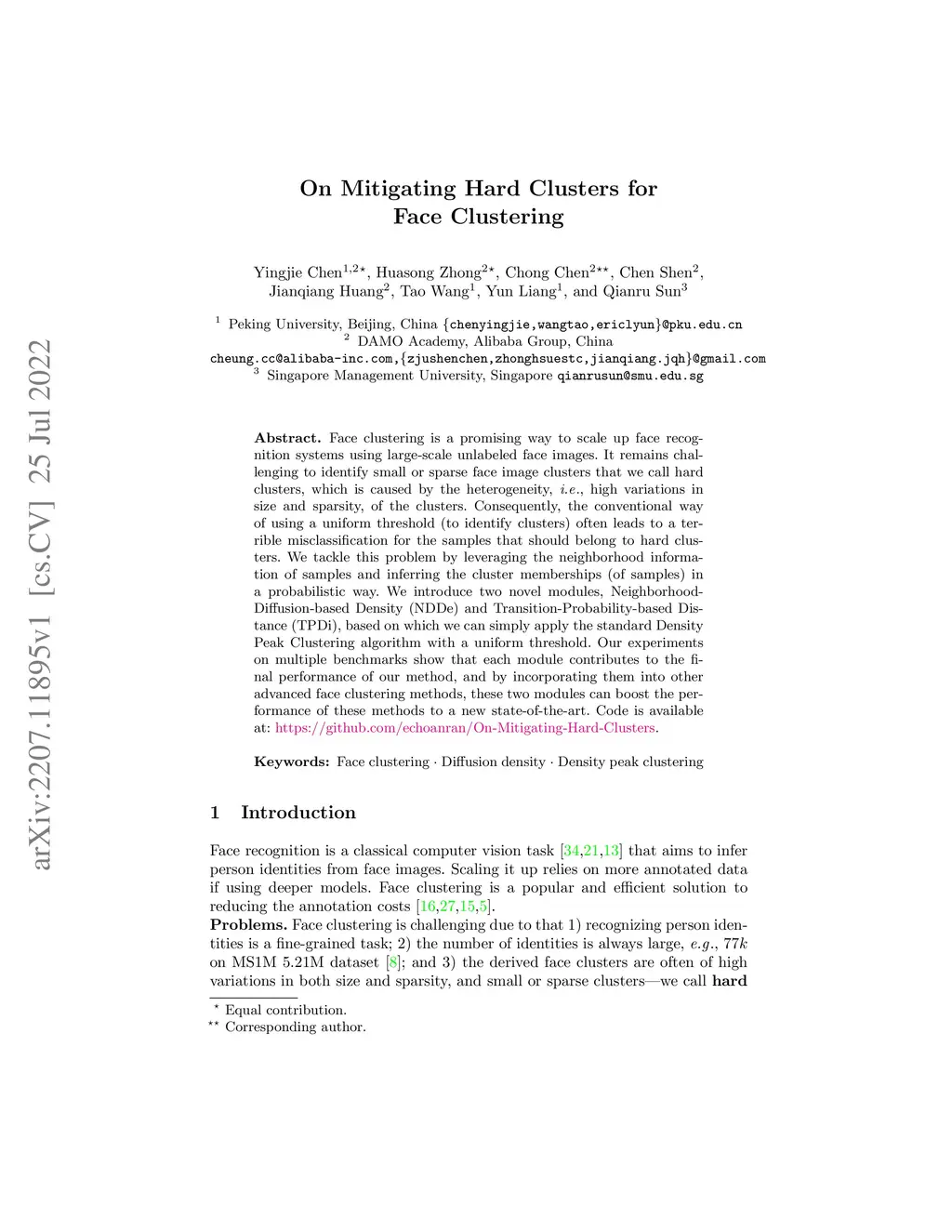Face clustering is a promising way to scale up face recognition systems using large-scale unlabeled face images. It remains challenging to identify small or sparse face image clusters that we call hard clusters, which is caused by the heterogeneity, \ie, high variations in size and sparsity, of the clusters. Consequently, the conventional way of using a uniform threshold (to identify clusters) often leads to a terrible misclassification for the samples that should belong to hard clusters. We tackle this problem by leveraging the neighborhood information of samples and inferring the cluster memberships (of samples) in a probabilistic way. We introduce two novel modules, Neighborhood-Diffusion-based Density (NDDe) and Transition-Probability-based Distance (TPDi), based on which we can simply apply the standard Density Peak Clustering algorithm with a uniform threshold. Our experiments on multiple benchmarks show that each module contributes to the final performance of our method, and by incorporating them into other advanced face clustering methods, these two modules can boost the performance of these methods to a new state-of-the-art. Code is available at: https://github.com/echoanran/On-Mitigating-Hard-Clusters.