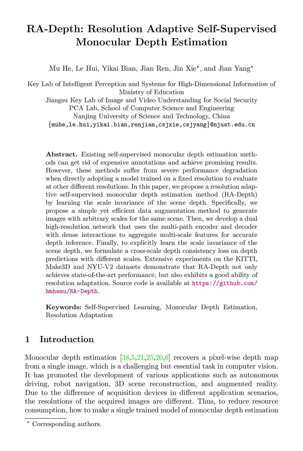 RA-Depth: Resolution Adaptive Self-Supervised Monocular Depth Estimation