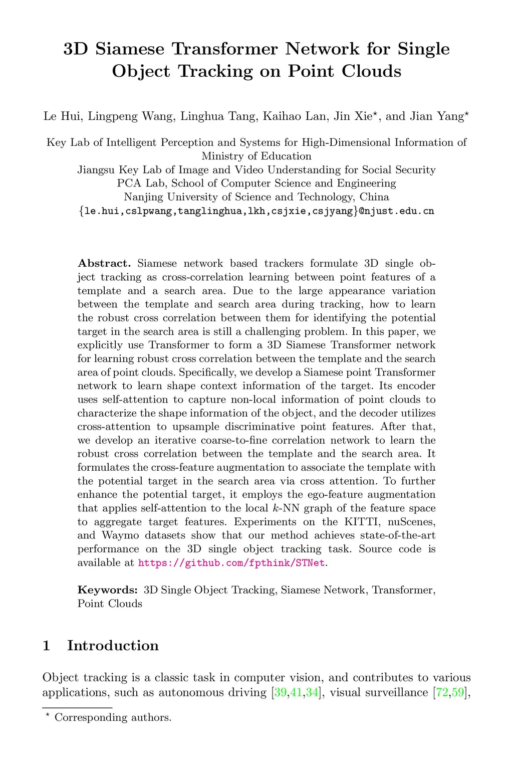 3D Siamese Transformer Network for Single Object Tracking on Point