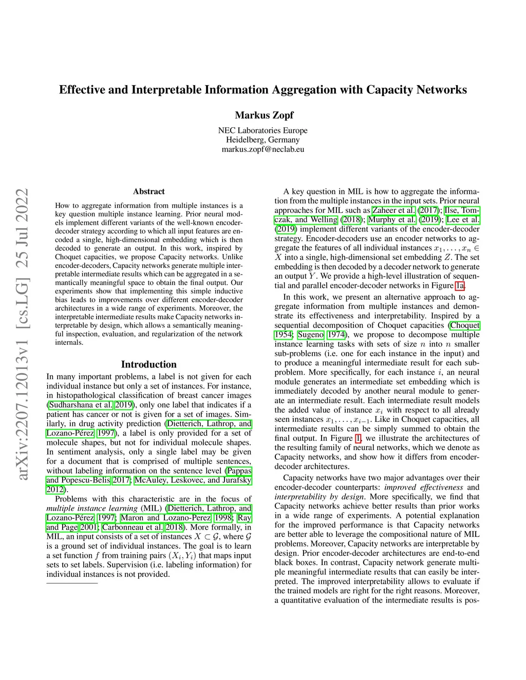 How to aggregate information from multiple instances is a key question multiple instance learning. Prior neural models implement different variants of the well-known encoder-decoder strategy according to which all input features are encoded a single, high-dimensional embedding which is then decoded to generate an output. In this work, inspired by Choquet capacities, we propose Capacity networks. Unlike encoder-decoders, Capacity networks generate multiple interpretable intermediate results which can be aggregated in a semantically meaningful space to obtain the final output. Our experiments show that implementing this simple inductive bias leads to improvements over different encoder-decoder architectures in a wide range of experiments. Moreover, the interpretable intermediate results make Capacity networks interpretable by design, which allows a semantically meaningful inspection, evaluation, and regularization of the network internals.