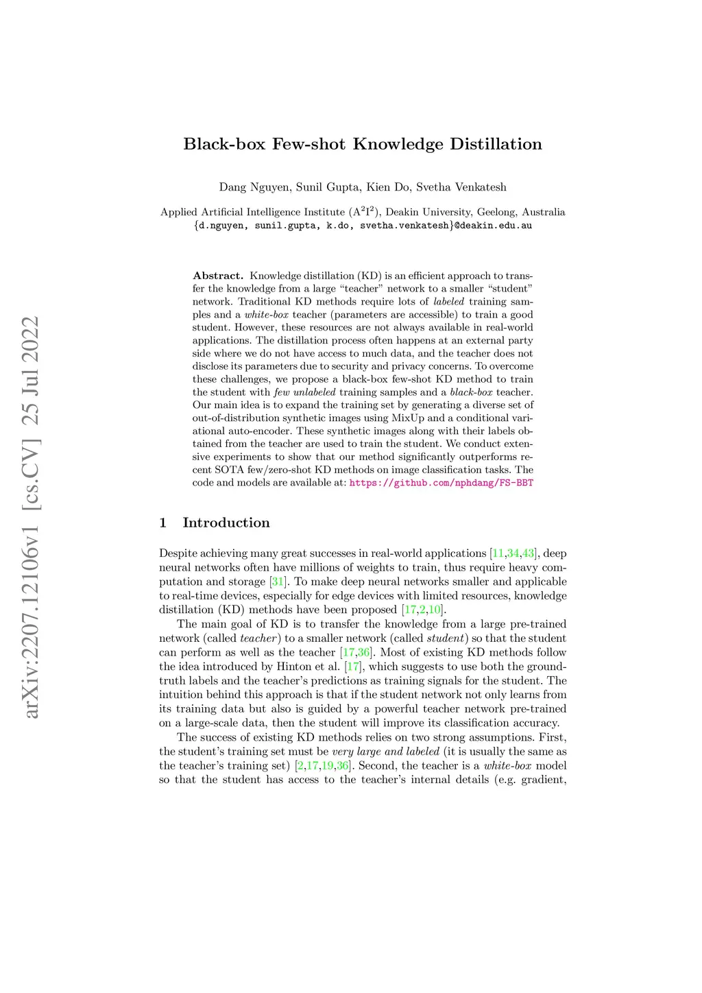 Knowledge distillation (KD) is an efficient approach to transfer the knowledge from a large "teacher" network to a smaller "student" network. Traditional KD methods require lots of labeled training samples and a white-box teacher (parameters are accessible) to train a good student. However, these resources are not always available in real-world applications. The distillation process often happens at an external party side where we do not have access to much data, and the teacher does not disclose its parameters due to security and privacy concerns. To overcome these challenges, we propose a black-box few-shot KD method to train the student with few unlabeled training samples and a black-box teacher. Our main idea is to expand the training set by generating a diverse set of out-of-distribution synthetic images using MixUp and a conditional variational auto-encoder. These synthetic images along with their labels obtained from the teacher are used to train the student. We conduct extensive experiments to show that our method significantly outperforms recent SOTA few/zero-shot KD methods on image classification tasks. The code and models are available at: https://github.com/nphdang/FS-BBT
