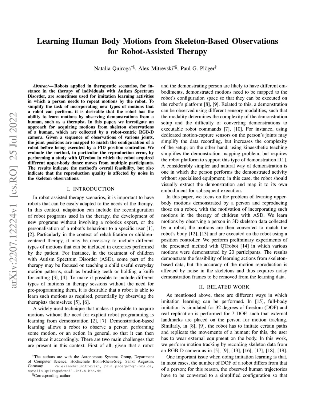Robots applied in therapeutic scenarios, for instance in the therapy of individuals with Autism Spectrum Disorder, are sometimes used for imitation learning activities in which a person needs to repeat motions by the robot. To simplify the task of incorporating new types of motions that a robot can perform, it is desirable that the robot has the ability to learn motions by observing demonstrations from a human, such as a therapist. In this paper, we investigate an approach for acquiring motions from skeleton observations of a human, which are collected by a robot-centric RGB-D camera. Given a sequence of observations of various joints, the joint positions are mapped to match the configuration of a robot before being executed by a PID position controller. We evaluate the method, in particular the reproduction error, by performing a study with QTrobot in which the robot acquired different upper-body dance moves from multiple participants. The results indicate the method's overall feasibility, but also indicate that the reproduction quality is affected by noise in the skeleton observations.