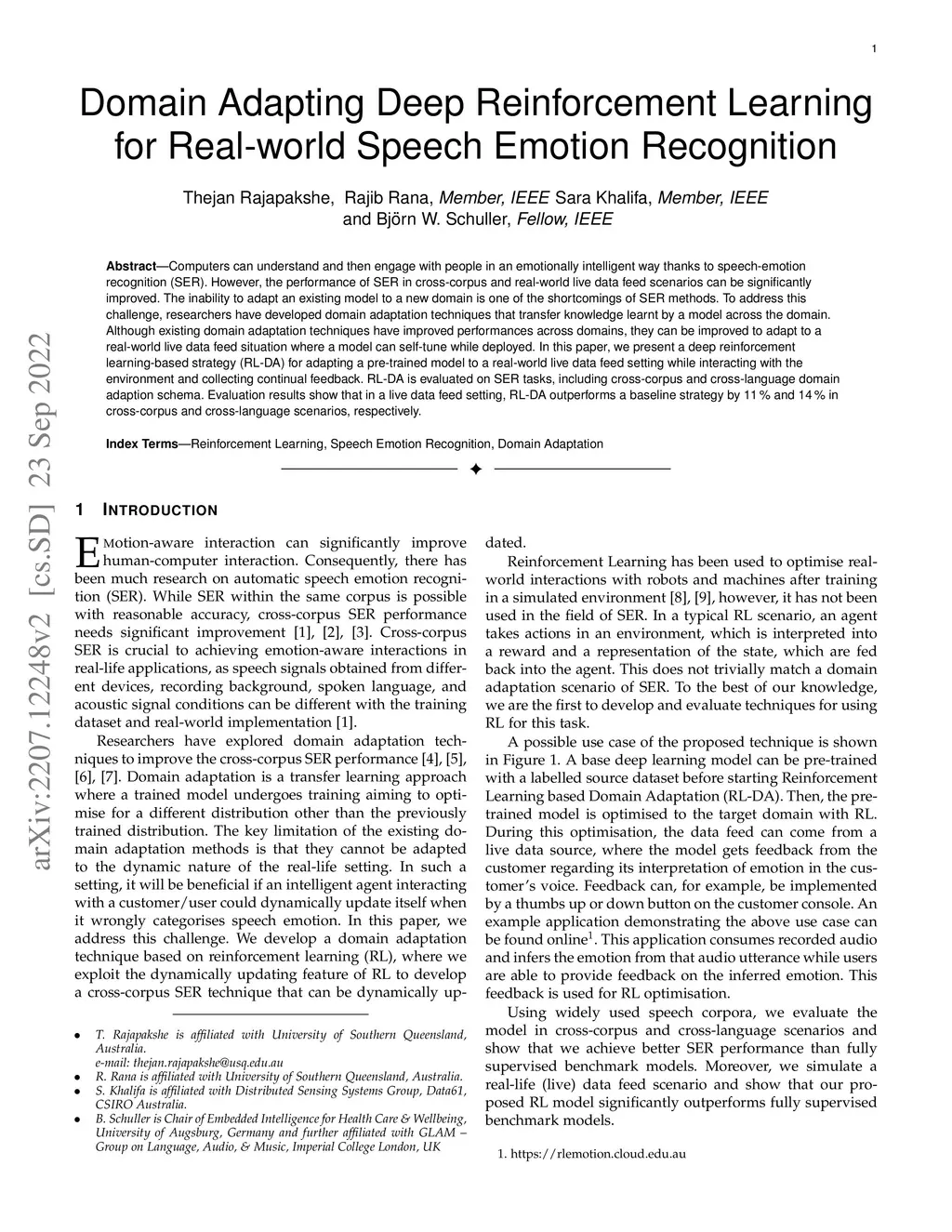 Computers can understand and then engage with people in an emotionally intelligent way thanks to speech-emotion recognition (SER). However, the performance of SER in cross-corpus and real-world live data feed scenarios can be significantly improved. The inability to adapt an existing model to a new domain is one of the shortcomings of SER methods. To address this challenge, researchers have developed domain adaptation techniques that transfer knowledge learnt by a model across the domain. Although existing domain adaptation techniques have improved performances across domains, they can be improved to adapt to a real-world live data feed situation where a model can self-tune while deployed. In this paper, we present a deep reinforcement learning-based strategy (RL-DA) for adapting a pre-trained model to a real-world live data feed setting while interacting with the environment and collecting continual feedback. RL-DA is evaluated on SER tasks, including cross-corpus and cross-language domain adaption schema. Evaluation results show that in a live data feed setting, RL-DA outperforms a baseline strategy by 11% and 14% in cross-corpus and cross-language scenarios, respectively.
