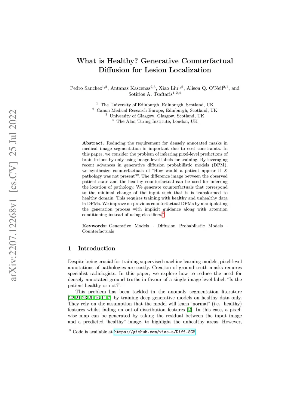 Reducing the requirement for densely annotated masks in medical image segmentation is important due to cost constraints. In this paper, we consider the problem of inferring pixel-level predictions of brain lesions by only using image-level labels for training. By leveraging recent advances in generative diffusion probabilistic models (DPM), we synthesize counterfactuals of "How would a patient appear if X pathology was not present?". The difference image between the observed patient state and the healthy counterfactual can be used for inferring the location of pathology. We generate counterfactuals that correspond to the minimal change of the input such that it is transformed to healthy domain. This requires training with healthy and unhealthy data in DPMs. We improve on previous counterfactual DPMs by manipulating the generation process with implicit guidance along with attention conditioning instead of using classifiers. Code is available at https://github.com/vios-s/Diff-SCM.