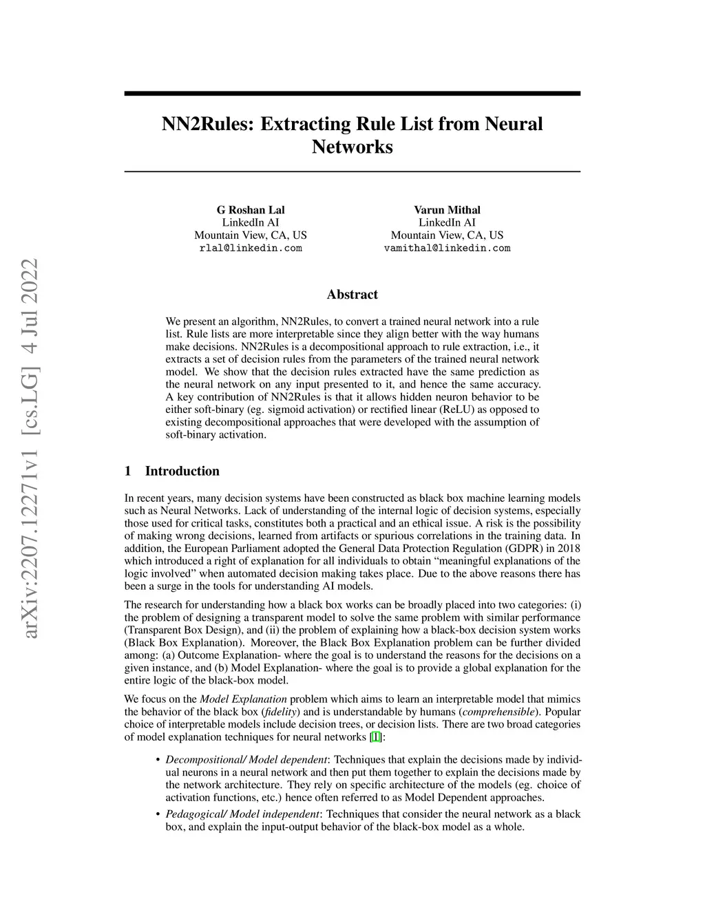 We present an algorithm, NN2Rules, to convert a trained neural network into a rule list. Rule lists are more interpretable since they align better with the way humans make decisions. NN2Rules is a decompositional approach to rule extraction, i.e., it extracts a set of decision rules from the parameters of the trained neural network model. We show that the decision rules extracted have the same prediction as the neural network on any input presented to it, and hence the same accuracy. A key contribution of NN2Rules is that it allows hidden neuron behavior to be either soft-binary (eg. sigmoid activation) or rectified linear (ReLU) as opposed to existing decompositional approaches that were developed with the assumption of soft-binary activation.