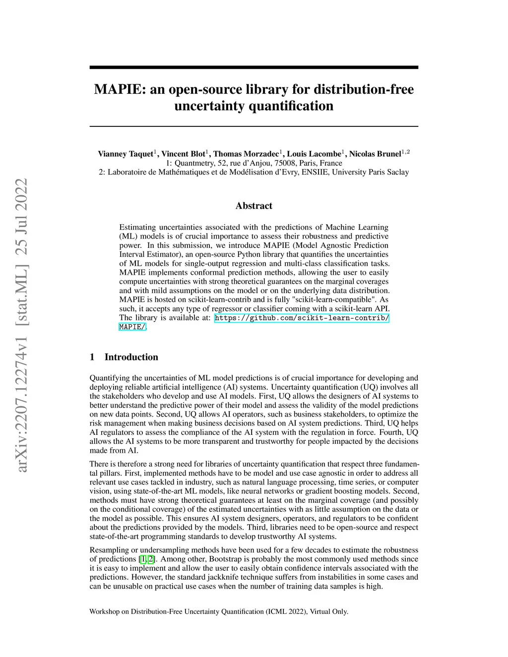 Estimating uncertainties associated with the predictions of Machine Learning (ML) models is of crucial importance to assess their robustness and predictive power. In this submission, we introduce MAPIE (Model Agnostic Prediction Interval Estimator), an open-source Python library that quantifies the uncertainties of ML models for single-output regression and multi-class classification tasks. MAPIE implements conformal prediction methods, allowing the user to easily compute uncertainties with strong theoretical guarantees on the marginal coverages and with mild assumptions on the model or on the underlying data distribution. MAPIE is hosted on scikit-learn-contrib and is fully "scikit-learn-compatible". As such, it accepts any type of regressor or classifier coming with a scikit-learn API. The library is available at: https://github.com/scikit-learn-contrib/MAPIE/.