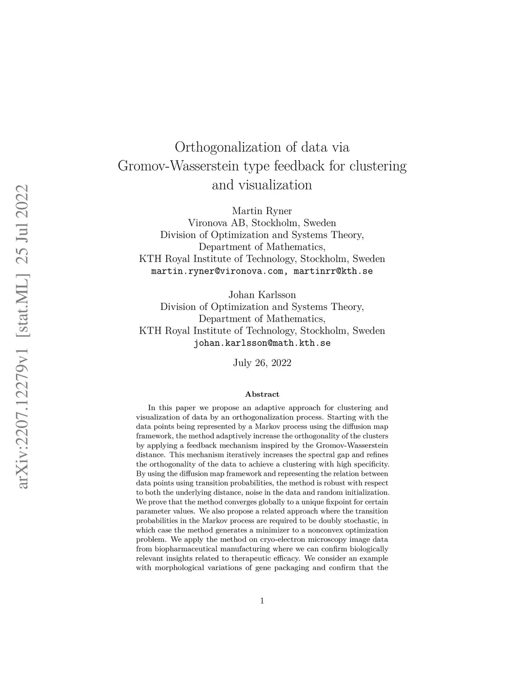 In this paper we propose an adaptive approach for clustering and visualization of data by an orthogonalization process. Starting with the data points being represented by a Markov process using the diffusion map framework, the method adaptively increase the orthogonality of the clusters by applying a feedback mechanism inspired by the Gromov-Wasserstein distance. This mechanism iteratively increases the spectral gap and refines the orthogonality of the data to achieve a clustering with high specificity. By using the diffusion map framework and representing the relation between data points using transition probabilities, the method is robust with respect to both the underlying distance, noise in the data and random initialization. We prove that the method converges globally to a unique fixpoint for certain parameter values. We also propose a related approach where the transition probabilities in the Markov process are required to be doubly stochastic, in which case the method generates a minimizer to a nonconvex optimization problem. We apply the method on cryo-electron microscopy image data from biopharmaceutical manufacturing where we can confirm biologically relevant insights related to therapeutic efficacy. We consider an example with morphological variations of gene packaging and confirm that the method produces biologically meaningful clustering results consistent with human expert classification.