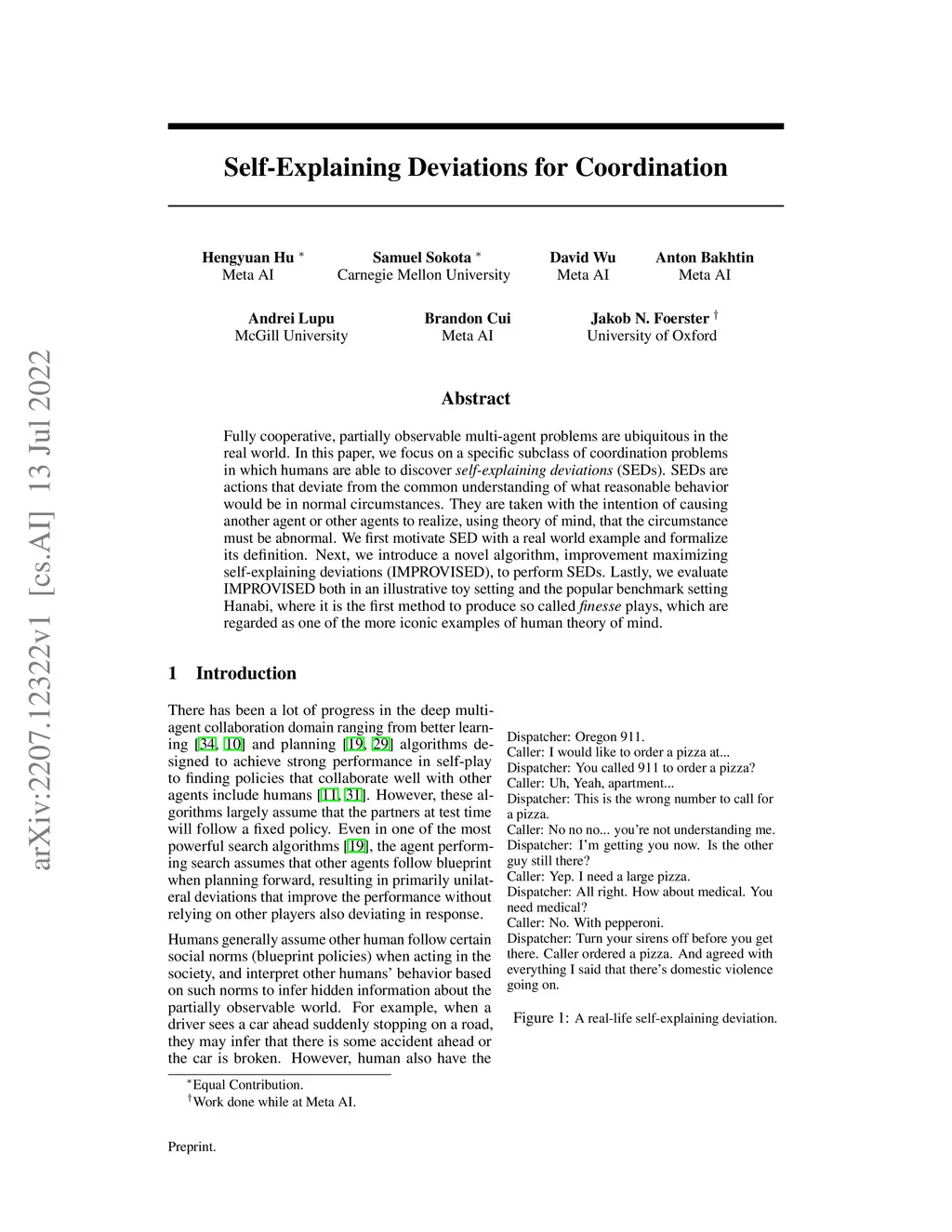 Fully cooperative, partially observable multi-agent problems are ubiquitous in the real world. In this paper, we focus on a specific subclass of coordination problems in which humans are able to discover self-explaining deviations (SEDs). SEDs are actions that deviate from the common understanding of what reasonable behavior would be in normal circumstances. They are taken with the intention of causing another agent or other agents to realize, using theory of mind, that the circumstance must be abnormal. We first motivate SED with a real world example and formalize its definition. Next, we introduce a novel algorithm, improvement maximizing self-explaining deviations (IMPROVISED), to perform SEDs. Lastly, we evaluate IMPROVISED both in an illustrative toy setting and the popular benchmark setting Hanabi, where it is the first method to produce so called finesse plays, which are regarded as one of the more iconic examples of human theory of mind.