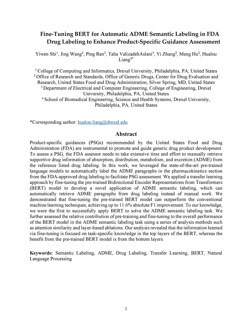 Product-specific guidances (PSGs) recommended by the United States Food and Drug Administration (FDA) are instrumental to promote and guide generic drug product development. To assess a PSG, the FDA assessor needs to take extensive time and effort to manually retrieve supportive drug information of absorption, distribution, metabolism, and excretion (ADME) from the reference listed drug labeling. In this work, we leveraged the state-of-the-art pre-trained language models to automatically label the ADME paragraphs in the pharmacokinetics section from the FDA-approved drug labeling to facilitate PSG assessment. We applied a transfer learning approach by fine-tuning the pre-trained Bidirectional Encoder Representations from Transformers (BERT) model to develop a novel application of ADME semantic labeling, which can automatically retrieve ADME paragraphs from drug labeling instead of manual work. We demonstrated that fine-tuning the pre-trained BERT model can outperform the conventional machine learning techniques, achieving up to 11.6% absolute F1 improvement. To our knowledge, we were the first to successfully apply BERT to solve the ADME semantic labeling task. We further assessed the relative contribution of pre-training and fine-tuning to the overall performance of the BERT model in the ADME semantic labeling task using a series of analysis methods such as attention similarity and layer-based ablations. Our analysis revealed that the information learned via fine-tuning is focused on task-specific knowledge in the top layers of the BERT, whereas the benefit from the pre-trained BERT model is from the bottom layers.