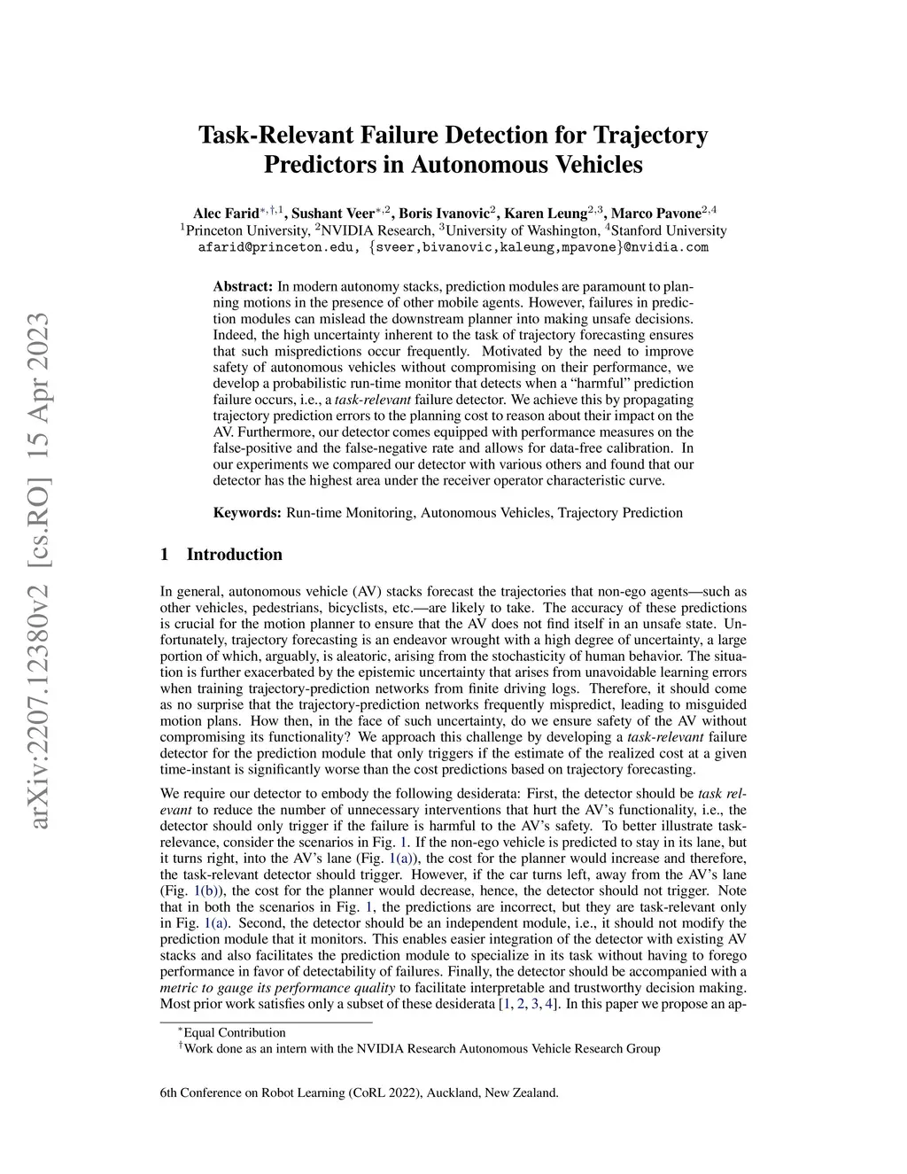 In modern autonomy stacks, prediction modules are paramount to planning motions in the presence of other mobile agents. However, failures in prediction modules can mislead the downstream planner into making unsafe decisions. Indeed, the high uncertainty inherent to the task of trajectory forecasting ensures that such mispredictions occur frequently. Motivated by the need to improve safety of autonomous vehicles without compromising on their performance, we develop a probabilistic run-time monitor that detects when a "harmful" prediction failure occurs, i.e., a task-relevant failure detector. We achieve this by propagating trajectory prediction errors to the planning cost to reason about their impact on the AV. Furthermore, our detector comes equipped with performance measures on the false-positive and the false-negative rate and allows for data-free calibration. In our experiments we compared our detector with various others and found that our detector has the highest area under the receiver operator characteristic curve.