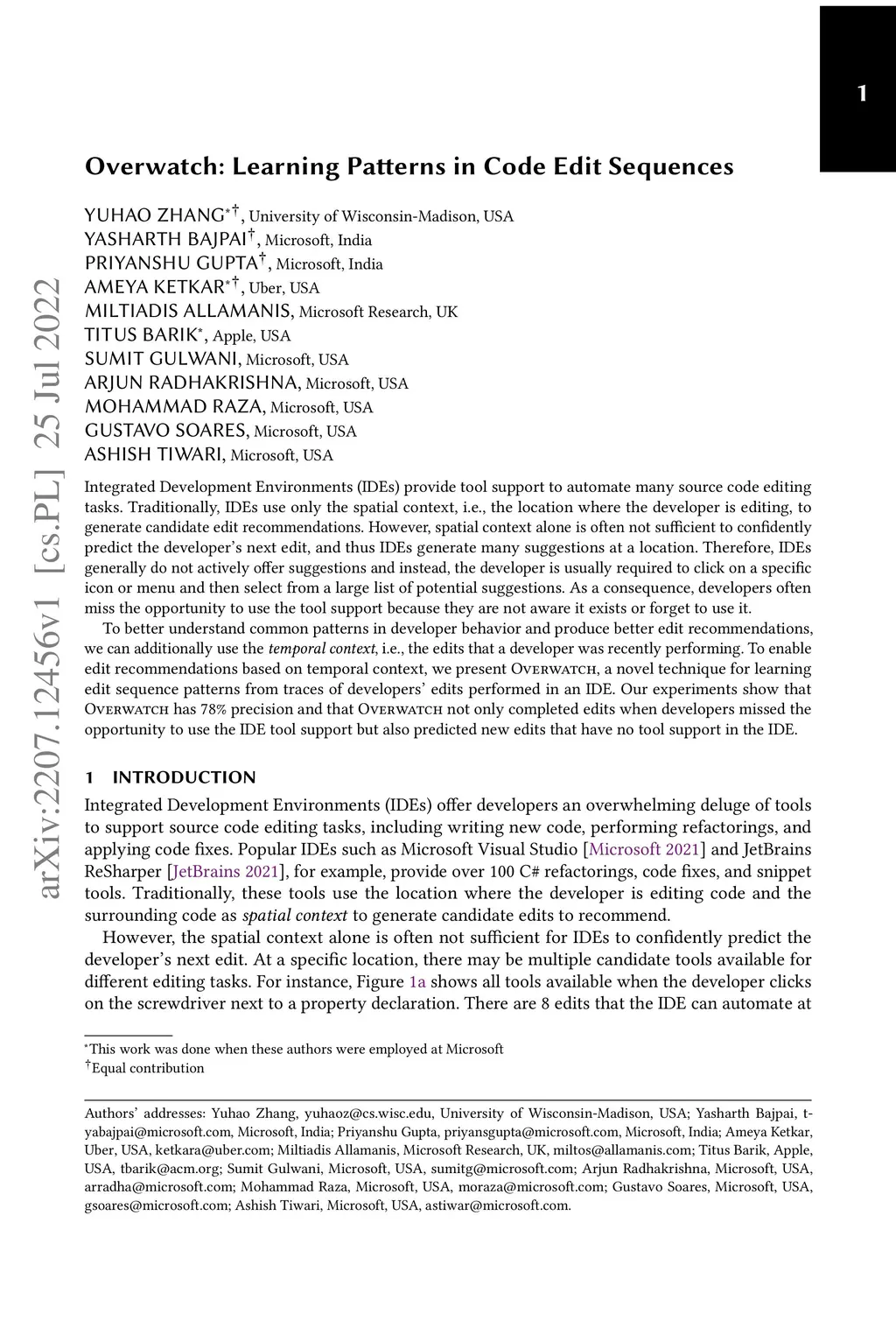 Overwatch: Learning Patterns in Code Edit Sequences