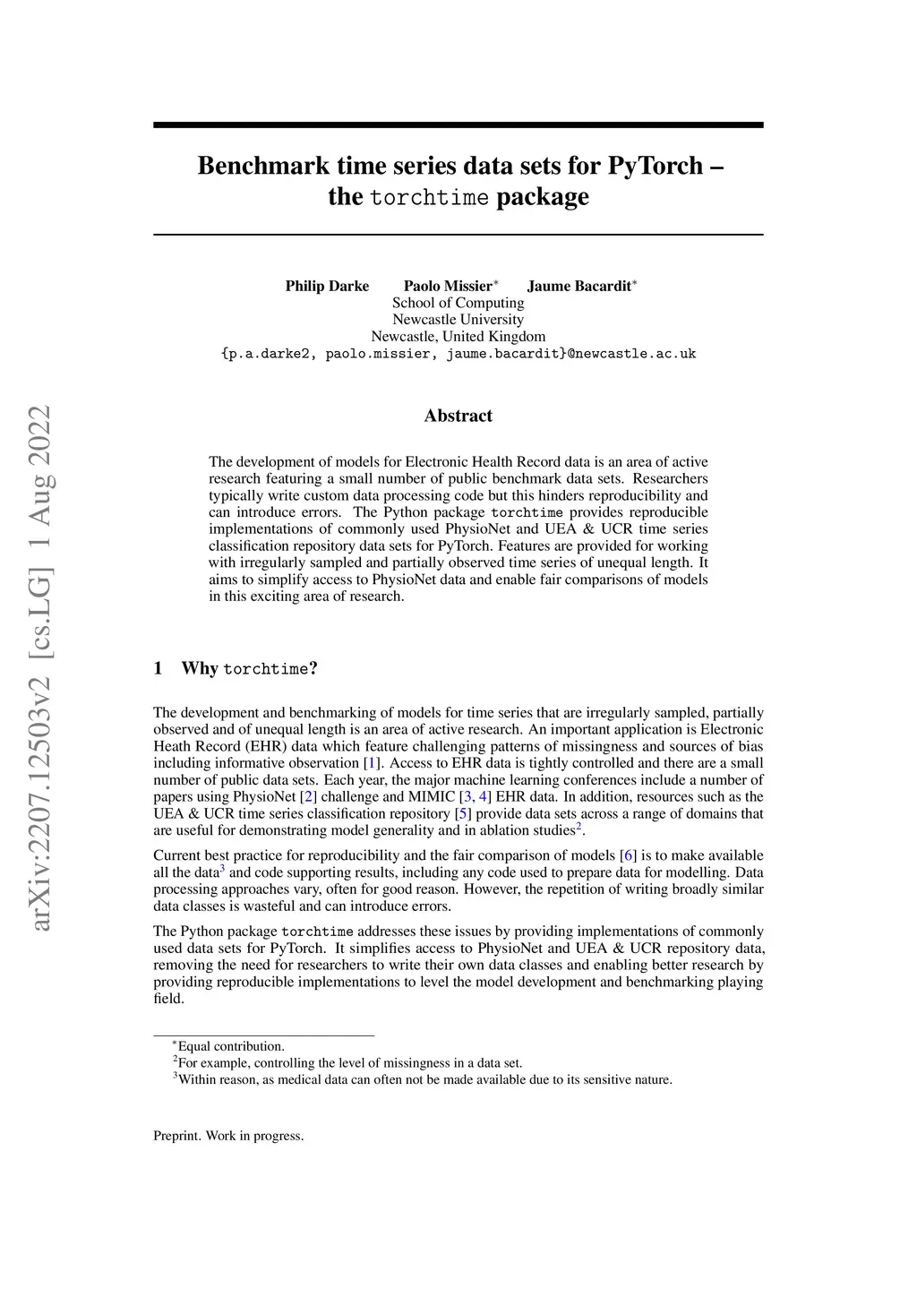 The development of models for Electronic Health Record data is an area of active research featuring a small number of public benchmark data sets. Researchers typically write custom data processing code but this hinders reproducibility and can introduce errors. The Python package torchtime provides reproducible implementations of commonly used PhysioNet and UEA & UCR time series classification repository data sets for PyTorch. Features are provided for working with irregularly sampled and partially observed time series of unequal length. It aims to simplify access to PhysioNet data and enable fair comparisons of models in this exciting area of research.