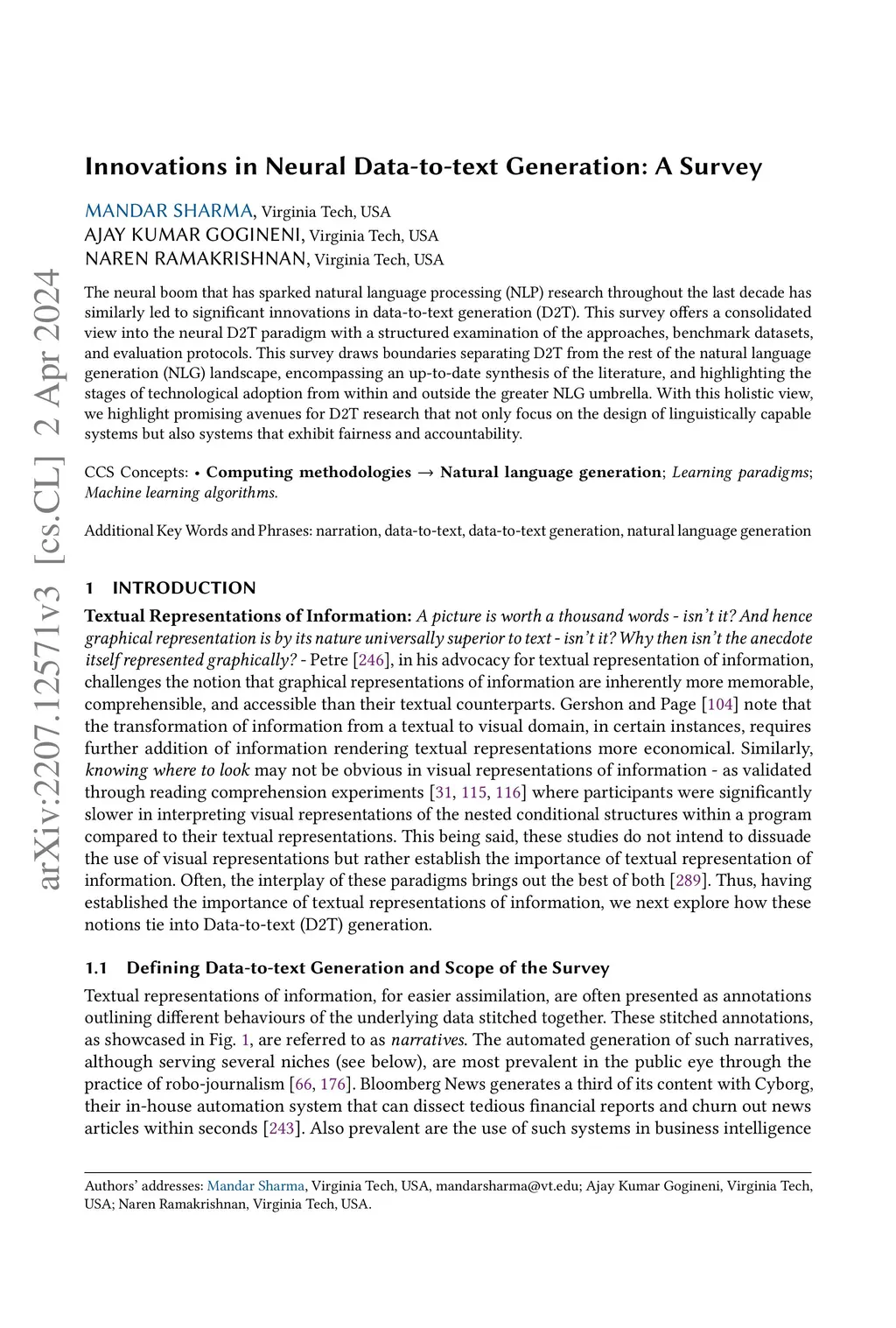 The neural boom that has sparked natural language processing (NLP) research through the last decade has similarly led to significant innovations in data-to-text generation (DTG). This survey offers a consolidated view into the neural DTG paradigm with a structured examination of the approaches, benchmark datasets, and evaluation protocols. This survey draws boundaries separating DTG from the rest of the natural language generation (NLG) landscape, encompassing an up-to-date synthesis of the literature, and highlighting the stages of technological adoption from within and outside the greater NLG umbrella. With this holistic view, we highlight promising avenues for DTG research that not only focus on the design of linguistically capable systems but also systems that exhibit fairness and accountability.
