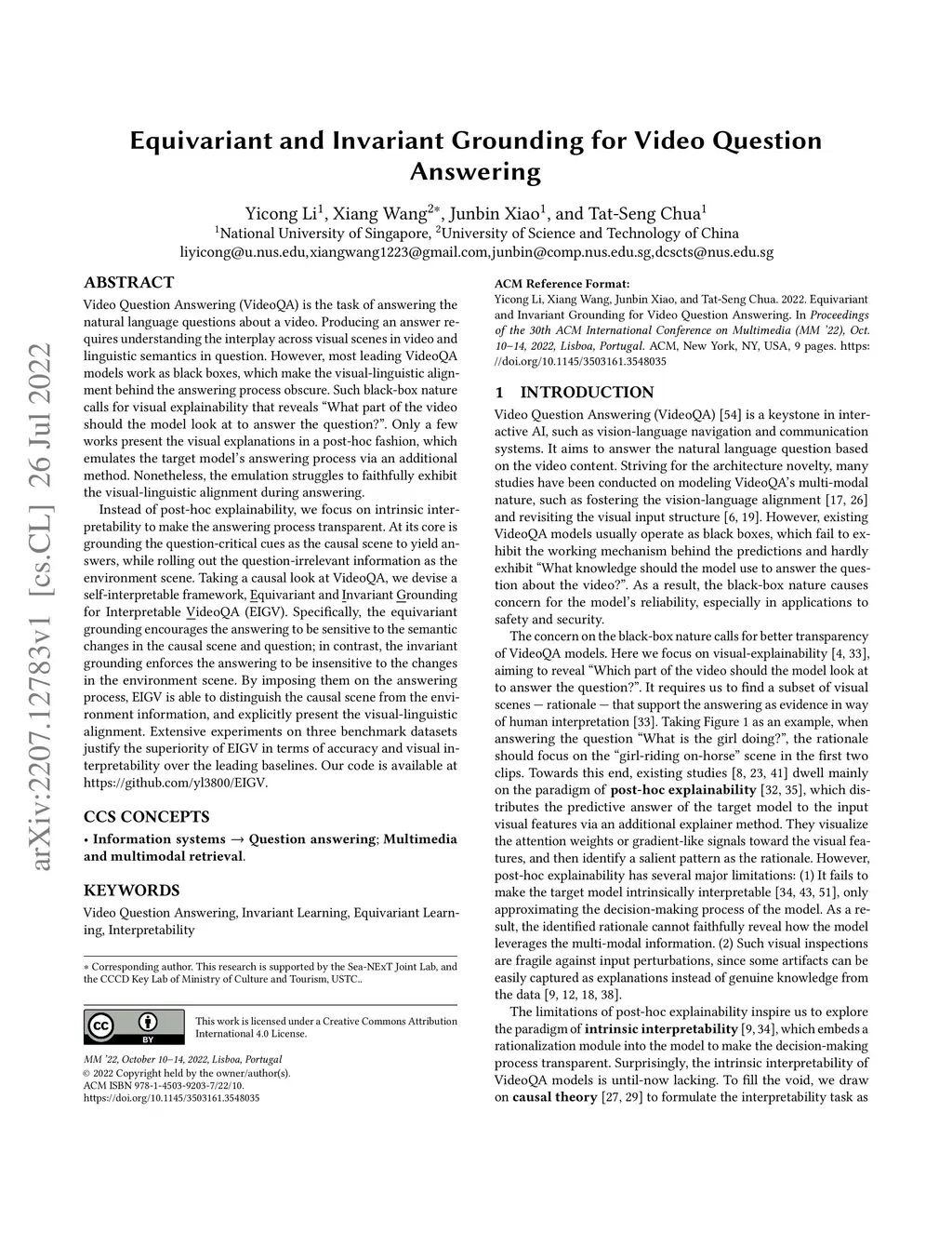 Video Question Answering (VideoQA) is the task of answering the natural language questions about a video. Producing an answer requires understanding the interplay across visual scenes in video and linguistic semantics in question. However, most leading VideoQA models work as black boxes, which make the visual-linguistic alignment behind the answering process obscure. Such black-box nature calls for visual explainability that reveals ``What part of the video should the model look at to answer the question?''. Only a few works present the visual explanations in a post-hoc fashion, which emulates the target model's answering process via an additional method. Nonetheless, the emulation struggles to faithfully exhibit the visual-linguistic alignment during answering. Instead of post-hoc explainability, we focus on intrinsic interpretability to make the answering process transparent. At its core is grounding the question-critical cues as the causal scene to yield answers, while rolling out the question-irrelevant information as the environment scene. Taking a causal look at VideoQA, we devise a self-interpretable framework, Equivariant and Invariant Grounding for Interpretable VideoQA (EIGV). Specifically, the equivariant grounding encourages the answering to be sensitive to the semantic changes in the causal scene and question; in contrast, the invariant grounding enforces the answering to be insensitive to the changes in the environment scene. By imposing them on the answering process, EIGV is able to distinguish the causal scene from the environment information, and explicitly present the visual-linguistic alignment. Extensive experiments on three benchmark datasets justify the superiority of EIGV in terms of accuracy and visual interpretability over the leading baselines.