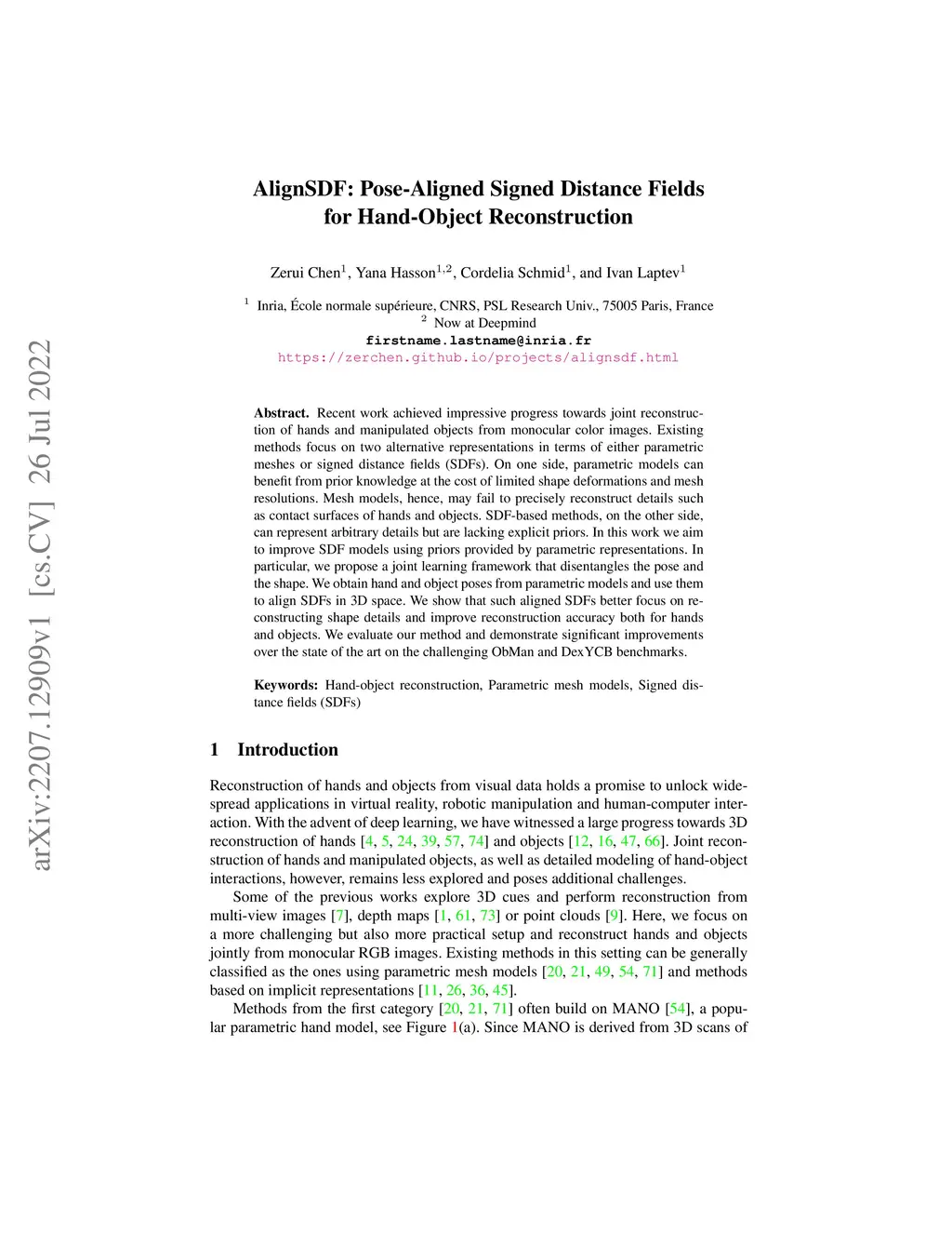 Recent work achieved impressive progress towards joint reconstruction of hands and manipulated objects from monocular color images. Existing methods focus on two alternative representations in terms of either parametric meshes or signed distance fields (SDFs). On one side, parametric models can benefit from prior knowledge at the cost of limited shape deformations and mesh resolutions. Mesh models, hence, may fail to precisely reconstruct details such as contact surfaces of hands and objects. SDF-based methods, on the other side, can represent arbitrary details but are lacking explicit priors. In this work we aim to improve SDF models using priors provided by parametric representations. In particular, we propose a joint learning framework that disentangles the pose and the shape. We obtain hand and object poses from parametric models and use them to align SDFs in 3D space. We show that such aligned SDFs better focus on reconstructing shape details and improve reconstruction accuracy both for hands and objects. We evaluate our method and demonstrate significant improvements over the state of the art on the challenging ObMan and DexYCB benchmarks.