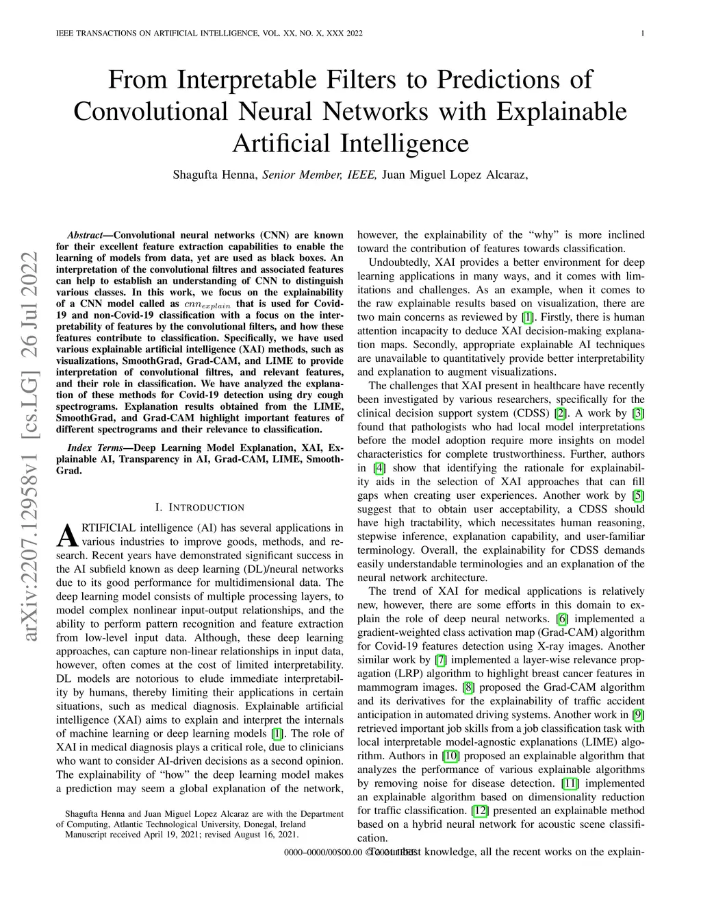 Convolutional neural networks (CNN) are known for their excellent feature extraction capabilities to enable the learning of models from data, yet are used as black boxes. An interpretation of the convolutional filtres and associated features can help to establish an understanding of CNN to distinguish various classes. In this work, we focus on the explainability of a CNN model called as cnnexplain that is used for Covid-19 and non-Covid-19 classification with a focus on the interpretability of features by the convolutional filters, and how these features contribute to classification. Specifically, we have used various explainable artificial intelligence (XAI) methods, such as visualizations, SmoothGrad, Grad-CAM, and LIME to provide interpretation of convolutional filtres, and relevant features, and their role in classification. We have analyzed the explanation of these methods for Covid-19 detection using dry cough spectrograms. Explanation results obtained from the LIME, SmoothGrad, and Grad-CAM highlight important features of different spectrograms and their relevance to classification.