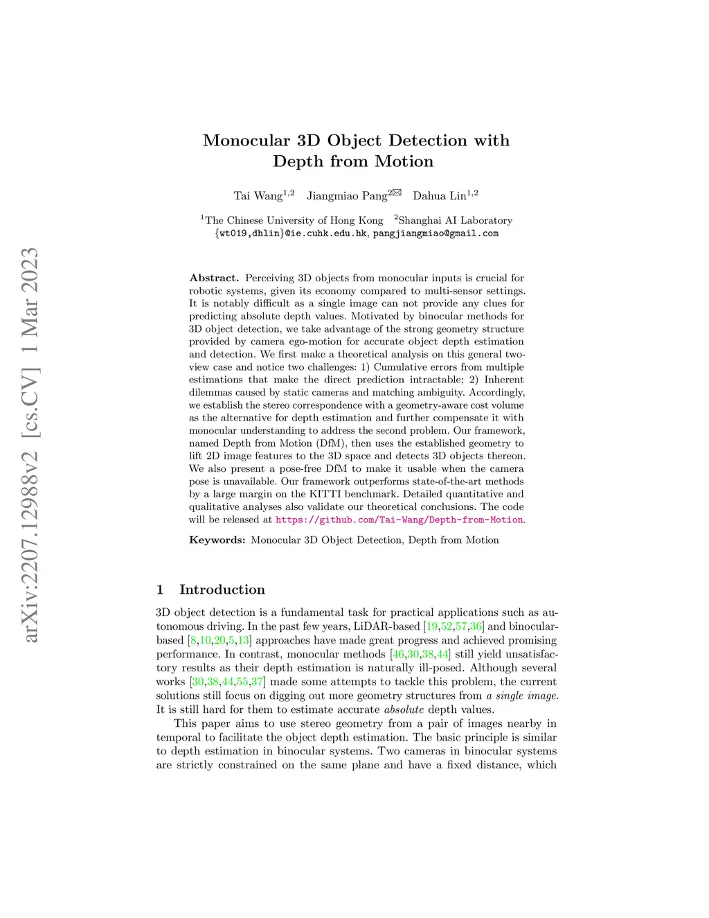 Perceiving 3D objects from monocular inputs is crucial for robotic systems, given its economy compared to multi-sensor settings. It is notably difficult as a single image can not provide any clues for predicting absolute depth values. Motivated by binocular methods for 3D object detection, we take advantage of the strong geometry structure provided by camera ego-motion for accurate object depth estimation and detection. We first make a theoretical analysis on this general two-view case and notice two challenges: 1) Cumulative errors from multiple estimations that make the direct prediction intractable; 2) Inherent dilemmas caused by static cameras and matching ambiguity. Accordingly, we establish the stereo correspondence with a geometry-aware cost volume as the alternative for depth estimation and further compensate it with monocular understanding to address the second problem. Our framework, named Depth from Motion (DfM), then uses the established geometry to lift 2D image features to the 3D space and detects 3D objects thereon. We also present a pose-free DfM to make it usable when the camera pose is unavailable. Our framework outperforms state-of-the-art methods by a large margin on the KITTI benchmark. Detailed quantitative and qualitative analyses also validate our theoretical conclusions. The code will be released at https://github.com/Tai-Wang/Depth-from-Motion.