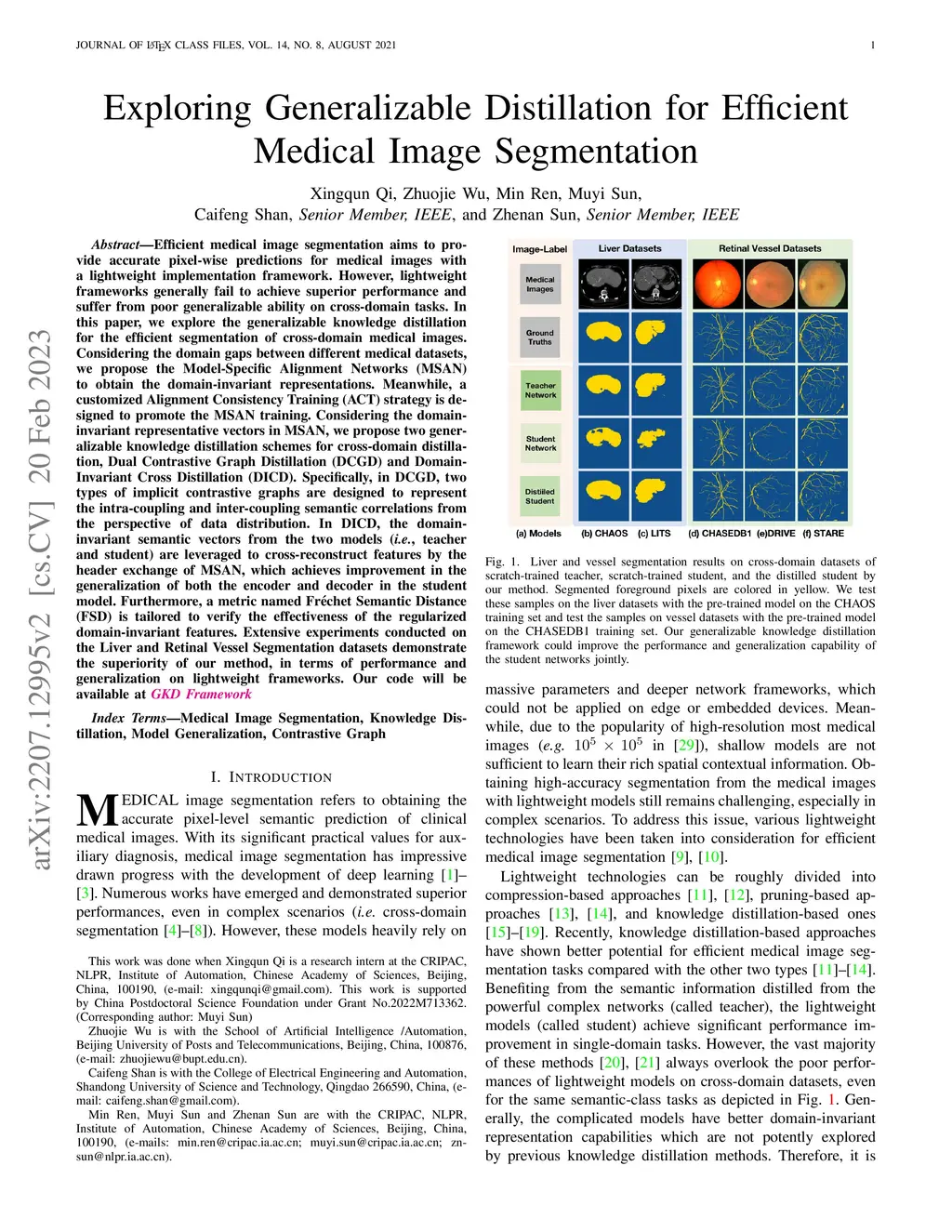 Efficient medical image segmentation aims to provide accurate pixel-wise predictions for medical images with a lightweight implementation framework. However, lightweight frameworks generally fail to achieve superior performance and suffer from poor generalizable ability on cross-domain tasks. In this paper, we explore the generalizable knowledge distillation for the efficient segmentation of cross-domain medical images. Considering the domain gaps between different medical datasets, we propose the Model-Specific Alignment Networks (MSAN) to obtain the domain-invariant representations. Meanwhile, a customized Alignment Consistency Training (ACT) strategy is designed to promote the MSAN training. Considering the domain-invariant representative vectors in MSAN, we propose two generalizable knowledge distillation schemes for cross-domain distillation, Dual Contrastive Graph Distillation (DCGD) and Domain-Invariant Cross Distillation (DICD). Specifically, in DCGD, two types of implicit contrastive graphs are designed to represent the intra-coupling and inter-coupling semantic correlations from the perspective of data distribution. In DICD, the domain-invariant semantic vectors from the two models (i.e., teacher and student) are leveraged to cross-reconstruct features by the header exchange of MSAN, which achieves improvement in the generalization of both the encoder and decoder in the student model. Furthermore, a metric named Frechet Semantic Distance (FSD) is tailored to verify the effectiveness of the regularized domain-invariant features. Extensive experiments conducted on the Liver and Retinal Vessel Segmentation datasets demonstrate the superiority of our method, in terms of performance and generalization on lightweight frameworks.