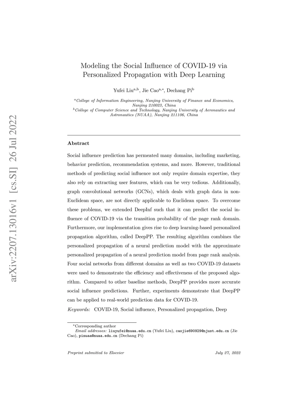 Social influence prediction has permeated many domains, including marketing, behavior prediction, recommendation systems, and more. However, traditional methods of predicting social influence not only require domain expertise,they also rely on extracting user features, which can be very tedious. Additionally, graph convolutional networks (GCNs), which deals with graph data in non-Euclidean space, are not directly applicable to Euclidean space. To overcome these problems, we extended DeepInf such that it can predict the social influence of COVID-19 via the transition probability of the page rank domain. Furthermore, our implementation gives rise to a deep learning-based personalized propagation algorithm, called DeepPP. The resulting algorithm combines the personalized propagation of a neural prediction model with the approximate personalized propagation of a neural prediction model from page rank analysis. Four social networks from different domains as well as two COVID-19 datasets were used to demonstrate the efficiency and effectiveness of the proposed algorithm. Compared to other baseline methods, DeepPP provides more accurate social influence predictions. Further, experiments demonstrate that DeepPP can be applied to real-world prediction data for COVID-19.