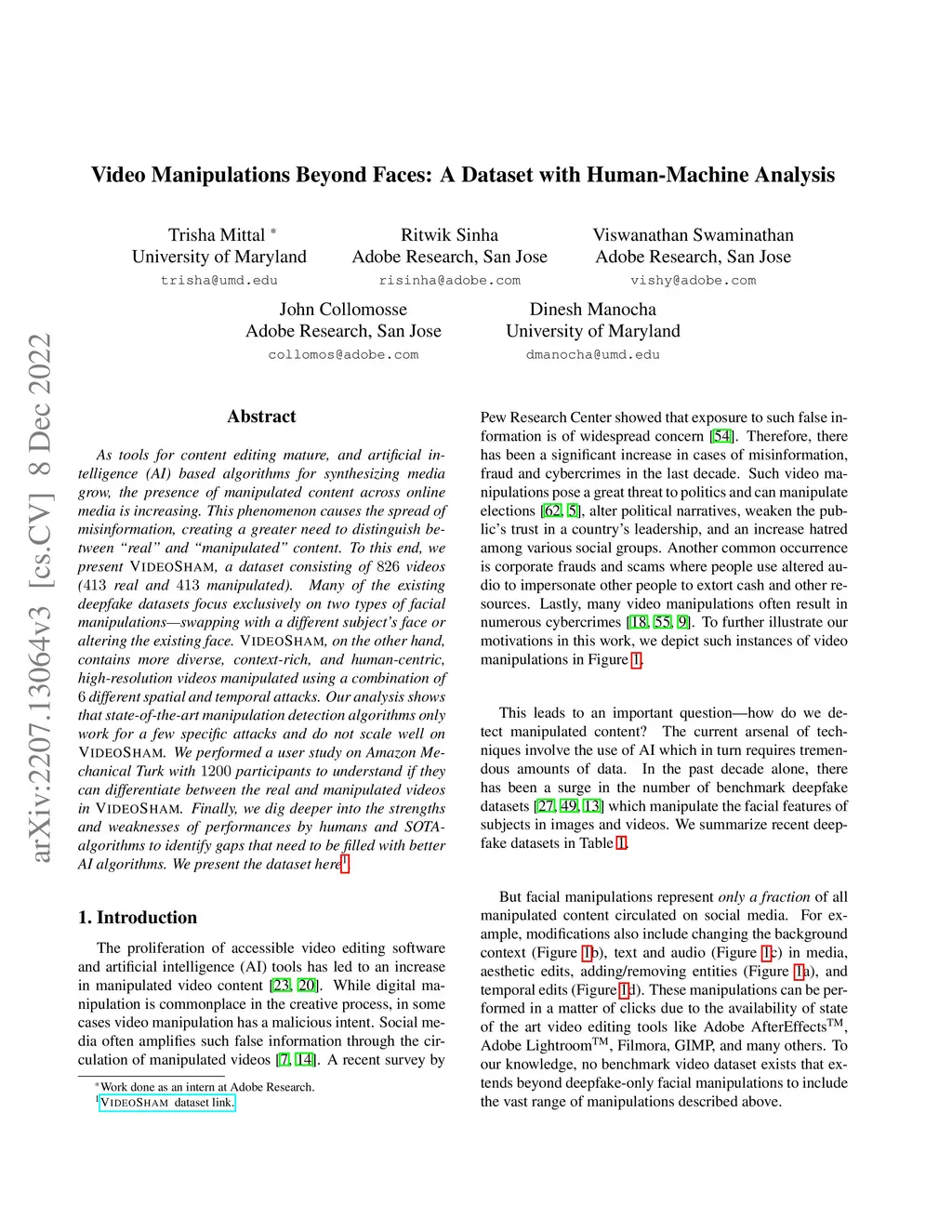 As tools for content editing mature, and artificial intelligence (AI) based algorithms for synthesizing media grow, the presence of manipulated content across online media is increasing. This phenomenon causes the spread of misinformation, creating a greater need to distinguish between "real" and "manipulated" content. To this end, we present VideoSham, a dataset consisting of 826 videos (413 real and 413 manipulated). Many of the existing deepfake datasets focus exclusively on two types of facial manipulations -- swapping with a different subject's face or altering the existing face. VideoSham, on the other hand, contains more diverse, context-rich, and human-centric, high-resolution videos manipulated using a combination of 6 different spatial and temporal attacks. Our analysis shows that state-of-the-art manipulation detection algorithms only work for a few specific attacks and do not scale well on VideoSham. We performed a user study on Amazon Mechanical Turk with 1200 participants to understand if they can differentiate between the real and manipulated videos in VideoSham. Finally, we dig deeper into the strengths and weaknesses of performances by humans and SOTA-algorithms to identify gaps that need to be filled with better AI algorithms.