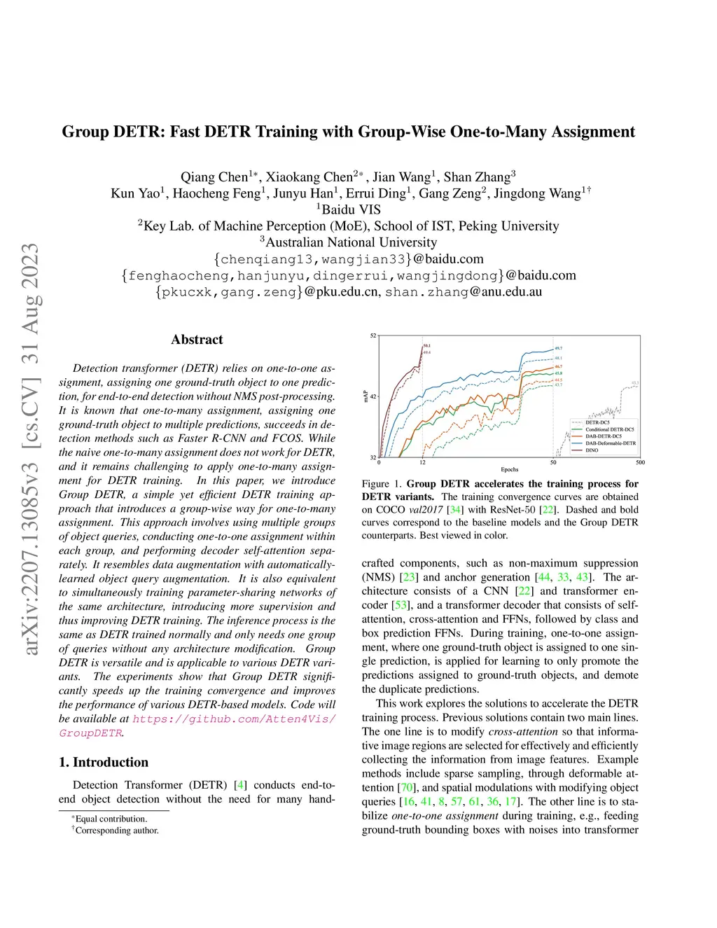 Detection transformer (DETR) relies on one-to-one assignment, assigning one ground-truth object to one prediction, for end-to-end detection without NMS post-processing. It is known that one-to-many assignment, assigning one ground-truth object to multiple predictions, succeeds in detection methods such as Faster R-CNN and FCOS. While the naive one-to-many assignment does not work for DETR, and it remains challenging to apply one-to-many assignment for DETR training. In this paper, we introduce Group DETR, a simple yet efficient DETR training approach that introduces a group-wise way for one-to-many assignment. This approach involves using multiple groups of object queries, conducting one-to-one assignment within each group, and performing decoder self-attention separately. It resembles data augmentation with automatically-learned object query augmentation. It is also equivalent to simultaneously training parameter-sharing networks of the same architecture, introducing more supervision and thus improving DETR training. The inference process is the same as DETR trained normally and only needs one group of queries without any architecture modification. Group DETR is versatile and is applicable to various DETR variants. The experiments show that Group DETR significantly speeds up the training convergence and improves the performance of various DETR-based models. Code will be available at \url{https://github.com/Atten4Vis/GroupDETR}.