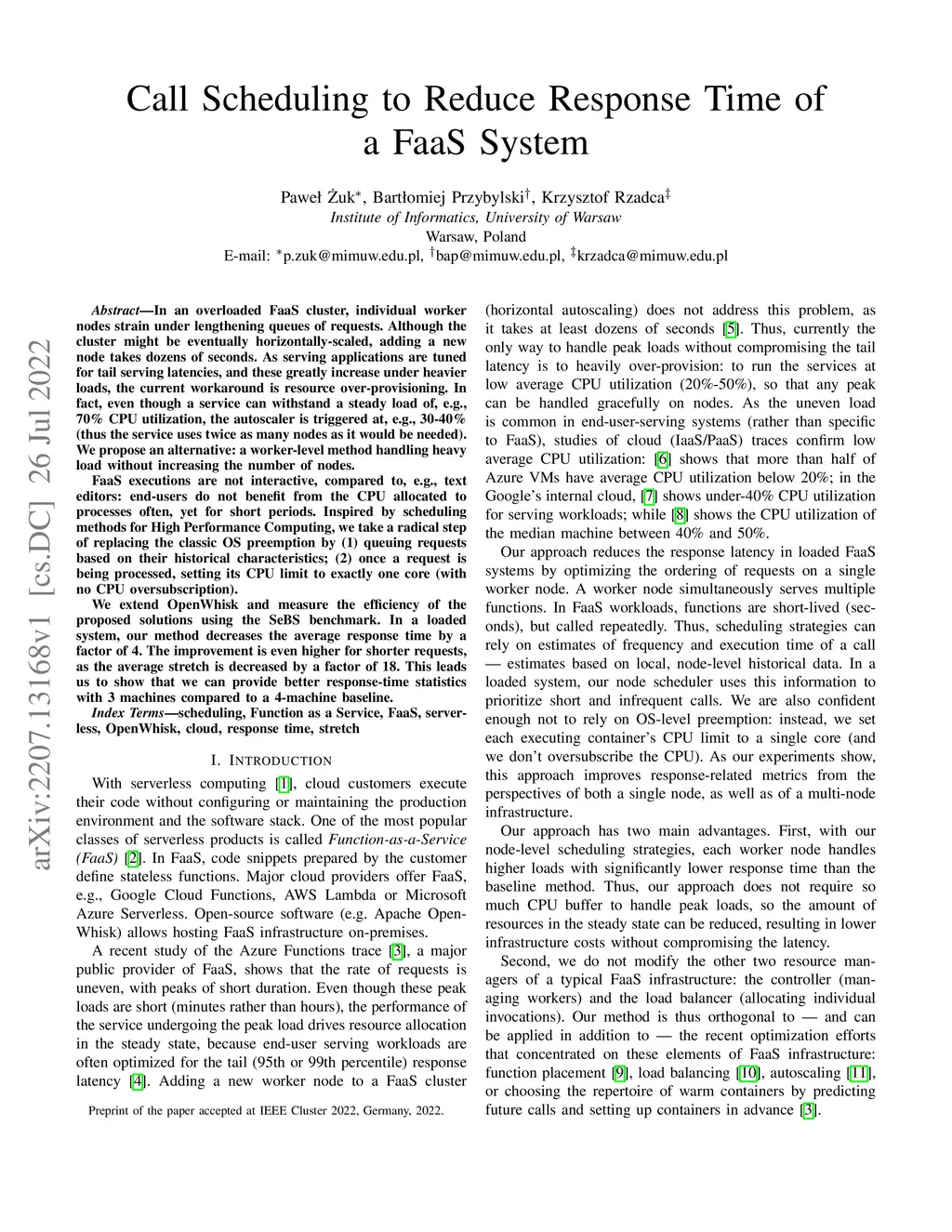 In an overloaded FaaS cluster, individual worker nodes strain under lengthening queues of requests. Although the cluster might be eventually horizontally-scaled, adding a new node takes dozens of seconds. As serving applications are tuned for tail serving latencies, and these greatly increase under heavier loads, the current workaround is resource over-provisioning. In fact, even though a service can withstand a steady load of, e.g., 70% CPU utilization, the autoscaler is triggered at, e.g., 30-40% (thus the service uses twice as many nodes as it would be needed). We propose an alternative: a worker-level method handling heavy load without increasing the number of nodes. FaaS executions are not interactive, compared to, e.g., text editors: end-users do not benefit from the CPU allocated to processes often, yet for short periods. Inspired by scheduling methods for High Performance Computing, we take a radical step of replacing the classic OS preemption by (1) queuing requests based on their historical characteristics; (2) once a request is being processed, setting its CPU limit to exactly one core (with no CPU oversubscription). We extend OpenWhisk and measure the efficiency of the proposed solutions using the SeBS benchmark. In a loaded system, our method decreases the average response time by a factor of 4. The improvement is even higher for shorter requests, as the average stretch is decreased by a factor of 18. This leads us to show that we can provide better response-time statistics with 3 machines compared to a 4-machine baseline.