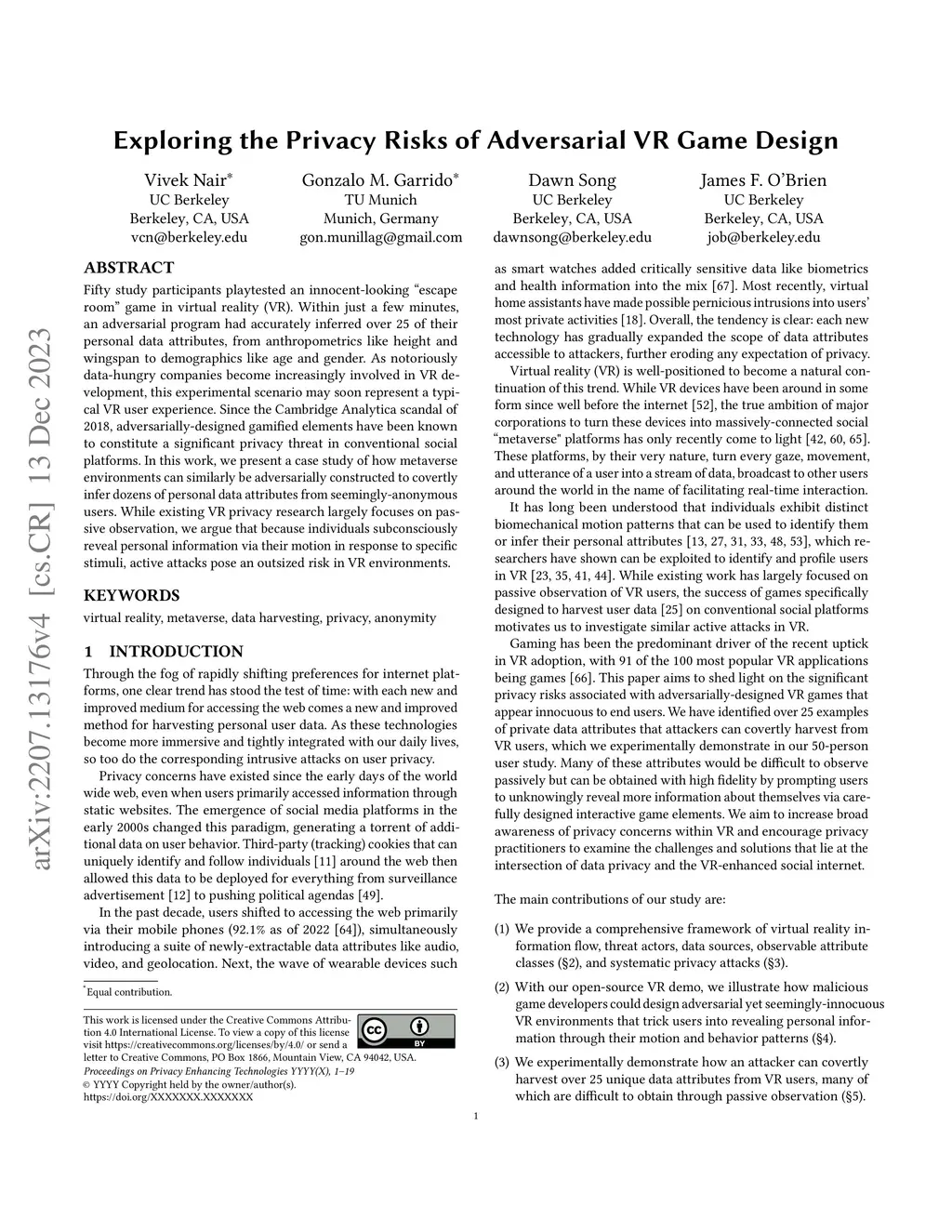 Exploring the Privacy Risks of Adversarial VR Game Design