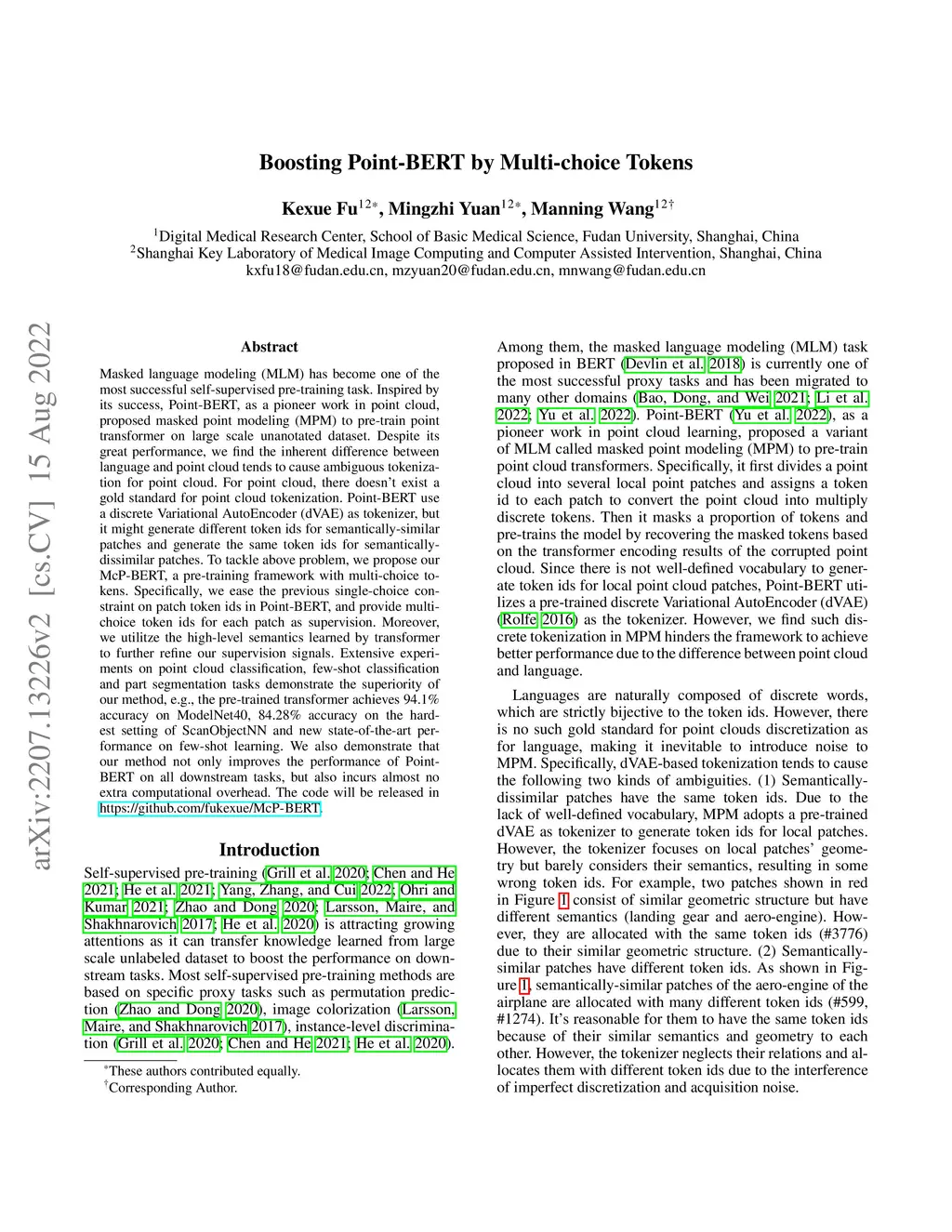 Masked language modeling (MLM) has become one of the most successful self-supervised pre-training task. Inspired by its success, Point-BERT, as a pioneer work in point cloud, proposed masked point modeling (MPM) to pre-train point transformer on large scale unanotated dataset. Despite its great performance, we find the inherent difference between language and point cloud tends to cause ambiguous tokenization for point cloud. For point cloud, there doesn't exist a gold standard for point cloud tokenization. Point-BERT use a discrete Variational AutoEncoder (dVAE) as tokenizer, but it might generate different token ids for semantically-similar patches and generate the same token ids for semantically-dissimilar patches. To tackle above problem, we propose our McP-BERT, a pre-training framework with multi-choice tokens. Specifically, we ease the previous single-choice constraint on patch token ids in Point-BERT, and provide multi-choice token ids for each patch as supervision. Moreover, we utilitze the high-level semantics learned by transformer to further refine our supervision signals. Extensive experiments on point cloud classification, few-shot classification and part segmentation tasks demonstrate the superiority of our method, e.g., the pre-trained transformer achieves 94.1% accuracy on ModelNet40, 84.28% accuracy on the hardest setting of ScanObjectNN and new state-of-the-art performance on few-shot learning. We also demonstrate that our method not only improves the performance of Point-BERT on all downstream tasks, but also incurs almost no extra computational overhead. The code will be released in https://github.com/fukexue/McP-BERT.
