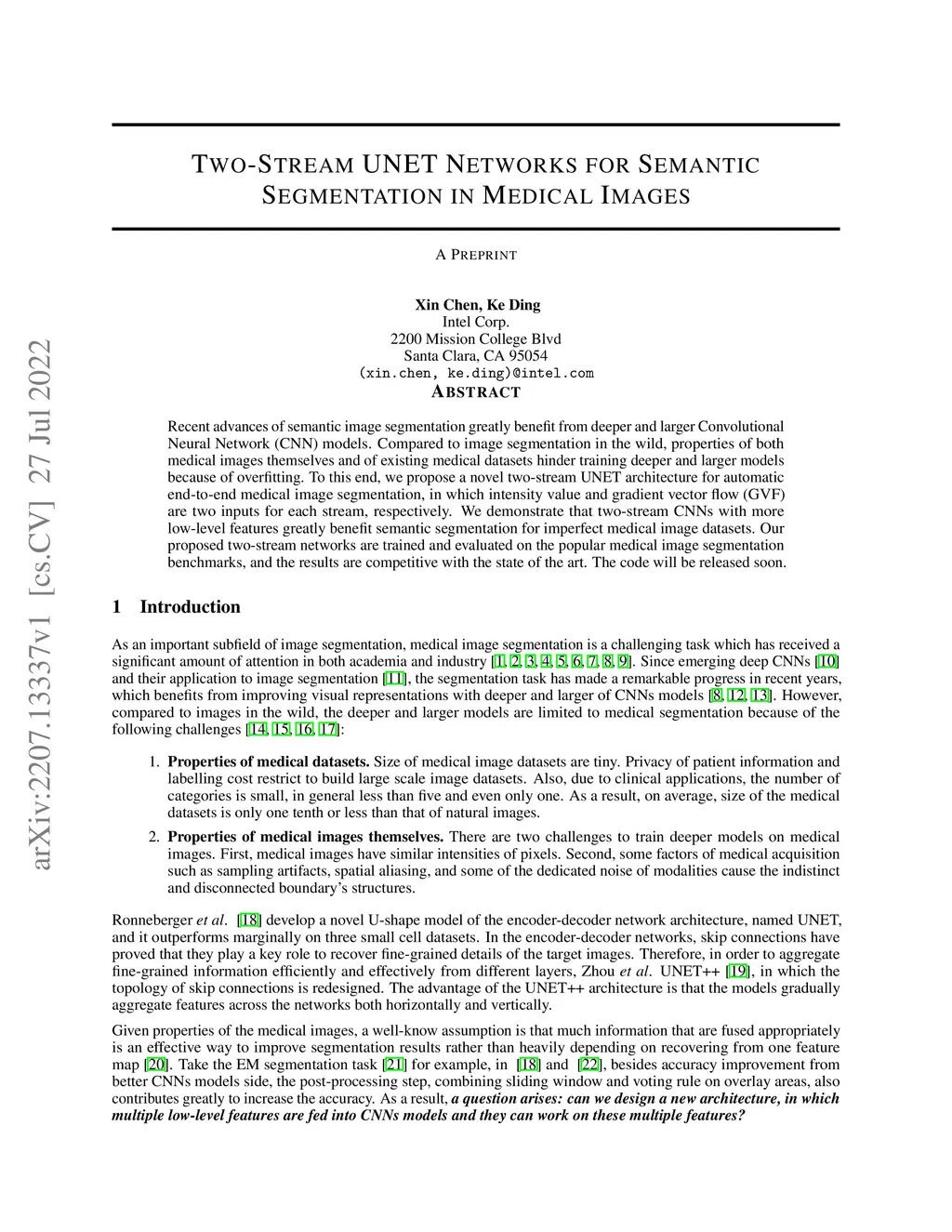 Recent advances of semantic image segmentation greatly benefit from deeper and larger Convolutional Neural Network (CNN) models. Compared to image segmentation in the wild, properties of both medical images themselves and of existing medical datasets hinder training deeper and larger models because of overfitting. To this end, we propose a novel two-stream UNET architecture for automatic end-to-end medical image segmentation, in which intensity value and gradient vector flow (GVF) are two inputs for each stream, respectively. We demonstrate that two-stream CNNs with more low-level features greatly benefit semantic segmentation for imperfect medical image datasets. Our proposed two-stream networks are trained and evaluated on the popular medical image segmentation benchmarks, and the results are competitive with the state of the art. The code will be released soon.