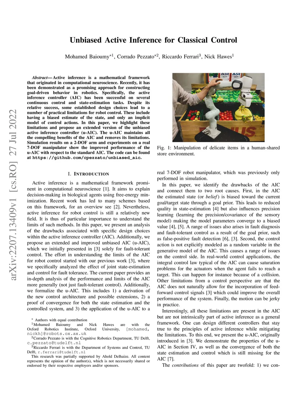 Active inference is a mathematical framework that originated in computational neuroscience. Recently, it has been demonstrated as a promising approach for constructing goal-driven behavior in robotics. Specifically, the active inference controller (AIC) has been successful on several continuous control and state-estimation tasks. Despite its relative success, some established design choices lead to a number of practical limitations for robot control. These include having a biased estimate of the state, and only an implicit model of control actions. In this paper, we highlight these limitations and propose an extended version of the unbiased active inference controller (u-AIC). The u-AIC maintains all the compelling benefits of the AIC and removes its limitations. Simulation results on a 2-DOF arm and experiments on a real 7-DOF manipulator show the improved performance of the u-AIC with respect to the standard AIC. The code can be found at https://github.com/cpezzato/unbiased_aic.