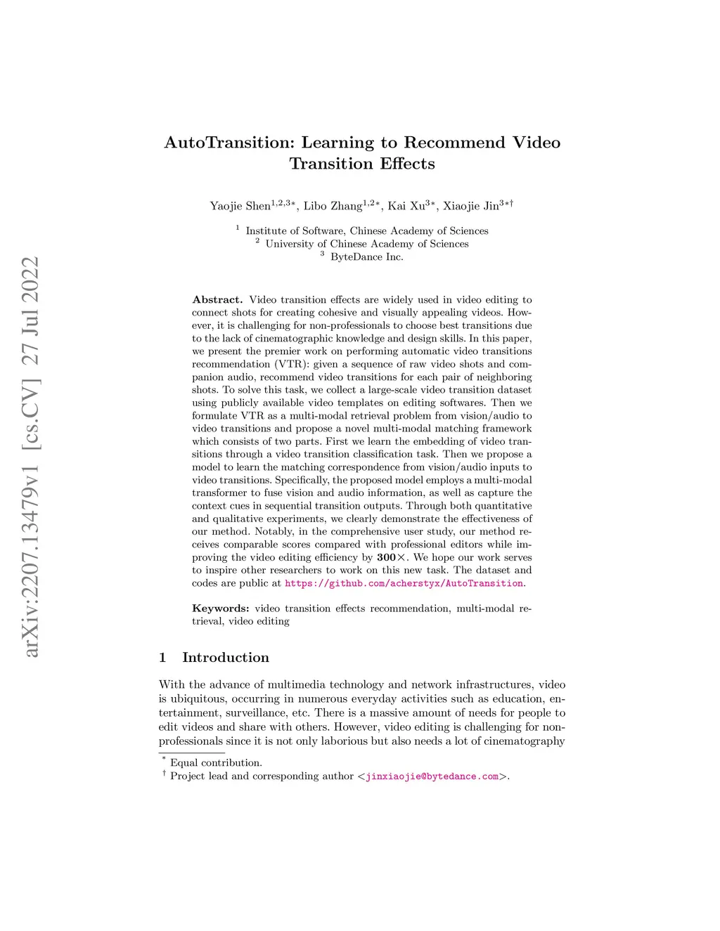 Video transition effects are widely used in video editing to connect shots for creating cohesive and visually appealing videos. However, it is challenging for non-professionals to choose best transitions due to the lack of cinematographic knowledge and design skills. In this paper, we present the premier work on performing automatic video transitions recommendation (VTR): given a sequence of raw video shots and companion audio, recommend video transitions for each pair of neighboring shots. To solve this task, we collect a large-scale video transition dataset using publicly available video templates on editing softwares. Then we formulate VTR as a multi-modal retrieval problem from vision/audio to video transitions and propose a novel multi-modal matching framework which consists of two parts. First we learn the embedding of video transitions through a video transition classification task. Then we propose a model to learn the matching correspondence from vision/audio inputs to video transitions. Specifically, the proposed model employs a multi-modal transformer to fuse vision and audio information, as well as capture the context cues in sequential transition outputs. Through both quantitative and qualitative experiments, we clearly demonstrate the effectiveness of our method. Notably, in the comprehensive user study, our method receives comparable scores compared with professional editors while improving the video editing efficiency by \textbf{300\scalebox{1.25}{}}. We hope our work serves to inspire other researchers to work on this new task. The dataset and codes are public at \url{https://github.com/acherstyx/AutoTransition}.