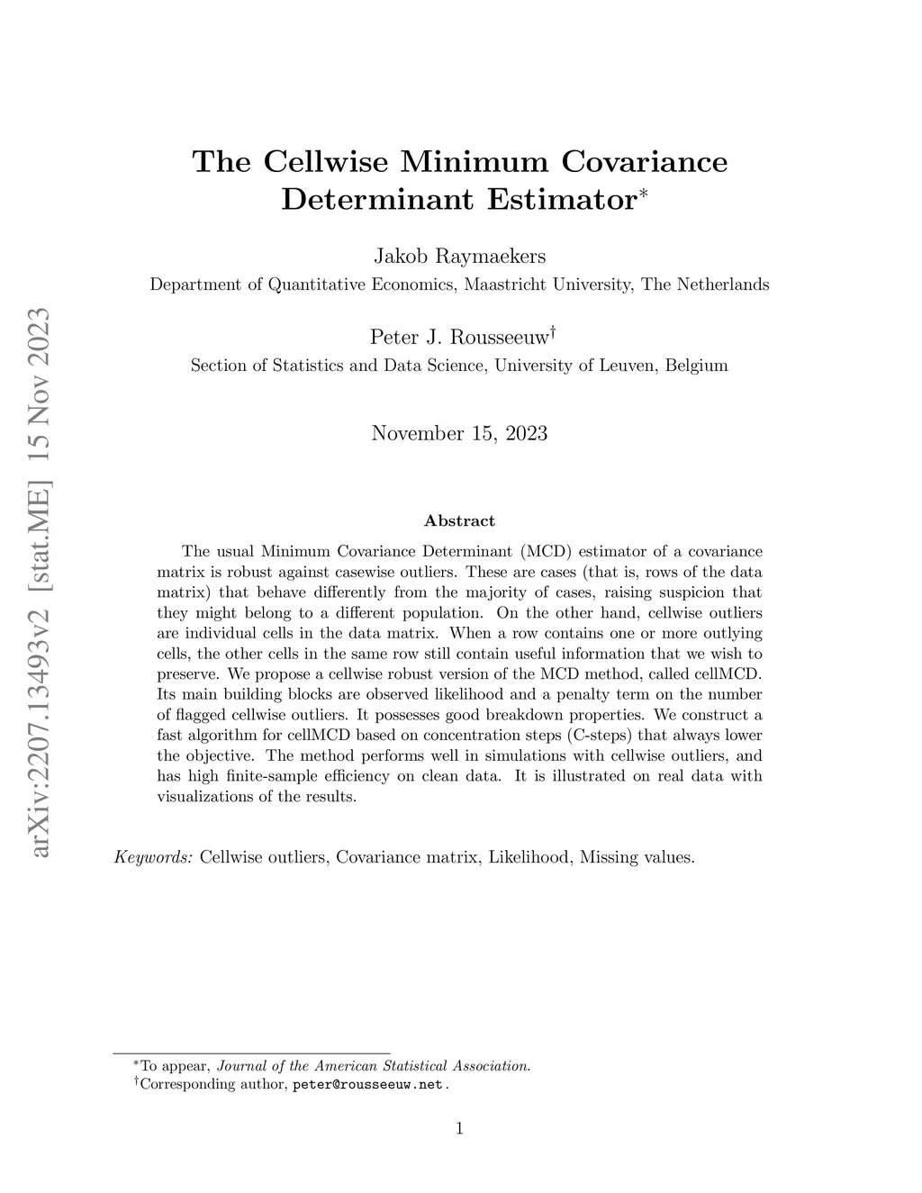 The usual Minimum Covariance Determinant (MCD) estimator of a covariance matrix is robust against casewise outliers. These are cases (that is, rows of the data matrix) that behave differently from the majority of cases, raising suspicion that they might belong to a different population. On the other hand, cellwise outliers are individual cells in the data matrix. When a row contains one or more outlying cells, the other cells in the same row still contain useful information that we wish to preserve. We propose a cellwise robust version of the MCD method, called cellMCD. Its main building blocks are observed likelihood and a penalty term on the number of flagged cellwise outliers. It possesses good breakdown properties. We construct a fast algorithm for cellMCD based on concentration steps (C-steps) that always lower the objective. The method performs well in simulations with cellwise outliers, and has high finite-sample efficiency on clean data. It is illustrated on real data with visualizations of the results.