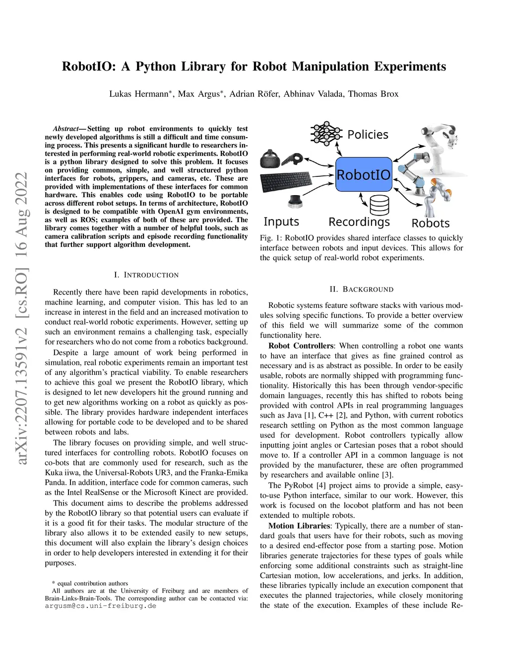 Setting up robot environments to quickly test newly developed algorithms is still a difficult and time consuming process. This presents a significant hurdle to researchers interested in performing real-world robotic experiments. RobotIO is a python library designed to solve this problem. It focuses on providing common, simple, and well structured python interfaces for robots, grippers, and cameras, etc. These are provided with implementations of these interfaces for common hardware. This enables code using RobotIO to be portable across different robot setups. In terms of architecture, RobotIO is designed to be compatible with OpenAI gym environments, as well as ROS; examples of both of these are provided. The library comes together with a number of helpful tools, such as camera calibration scripts and episode recording functionality that further support algorithm development.