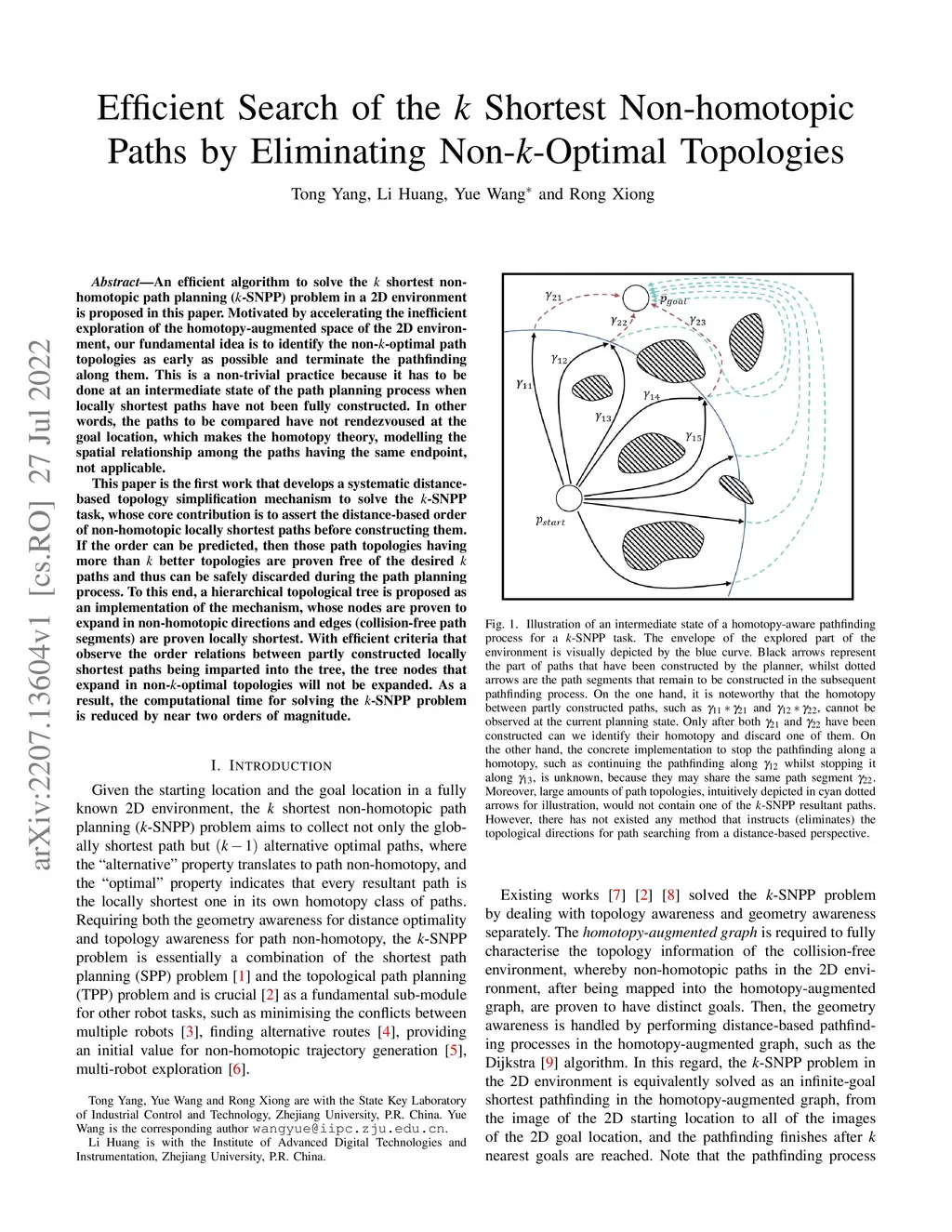 An efficient algorithm to solve the shortest non-homotopic path planning (-SNPP) problem in a 2D environment is proposed in this paper. Motivated by accelerating the inefficient exploration of the homotopy-augmented space of the 2D environment, our fundamental idea is to identify the non--optimal path topologies as early as possible and terminate the pathfinding along them. This is a non-trivial practice because it has to be done at an intermediate state of the path planning process when locally shortest paths have not been fully constructed. In other words, the paths to be compared have not rendezvoused at the goal location, which makes the homotopy theory, modelling the spatial relationship among the paths having the same endpoint, not applicable. This paper is the first work that develops a systematic distance-based topology simplification mechanism to solve the -SNPP task, whose core contribution is to assert the distance-based order of non-homotopic locally shortest paths before constructing them. If the order can be predicted, then those path topologies having more than better topologies are proven free of the desired paths and thus can be safely discarded during the path planning process. To this end, a hierarchical topological tree is proposed as an implementation of the mechanism, whose nodes are proven to expand in non-homotopic directions and edges (collision-free path segments) are proven locally shortest. With efficient criteria that observe the order relations between partly constructed locally shortest paths being imparted into the tree, the tree nodes that expand in non--optimal topologies will not be expanded. As a result, the computational time for solving the -SNPP problem is reduced by near two orders of magnitude.