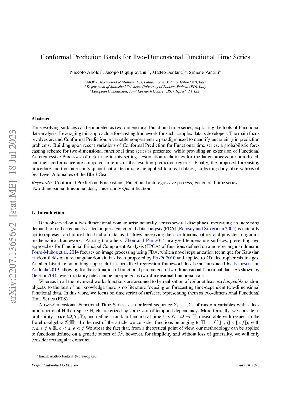 Time evolving surfaces can be modeled as two-dimensional Functional time series, exploiting the tools of Functional data analysis. Leveraging this approach, a forecasting framework for such complex data is developed. The main focus revolves around Conformal Prediction, a versatile nonparametric paradigm used to quantify uncertainty in prediction problems. Building upon recent variations of Conformal Prediction for Functional time series, a probabilistic forecasting scheme for two-dimensional functional time series is presented, while providing an extension of Functional Autoregressive Processes of order one to this setting. Estimation techniques for the latter process are introduced and their performance are compared in terms of the resulting prediction regions. Finally, the proposed forecasting procedure and the uncertainty quantification technique are applied to a real dataset, collecting daily observations of Sea Level Anomalies of the Black Sea