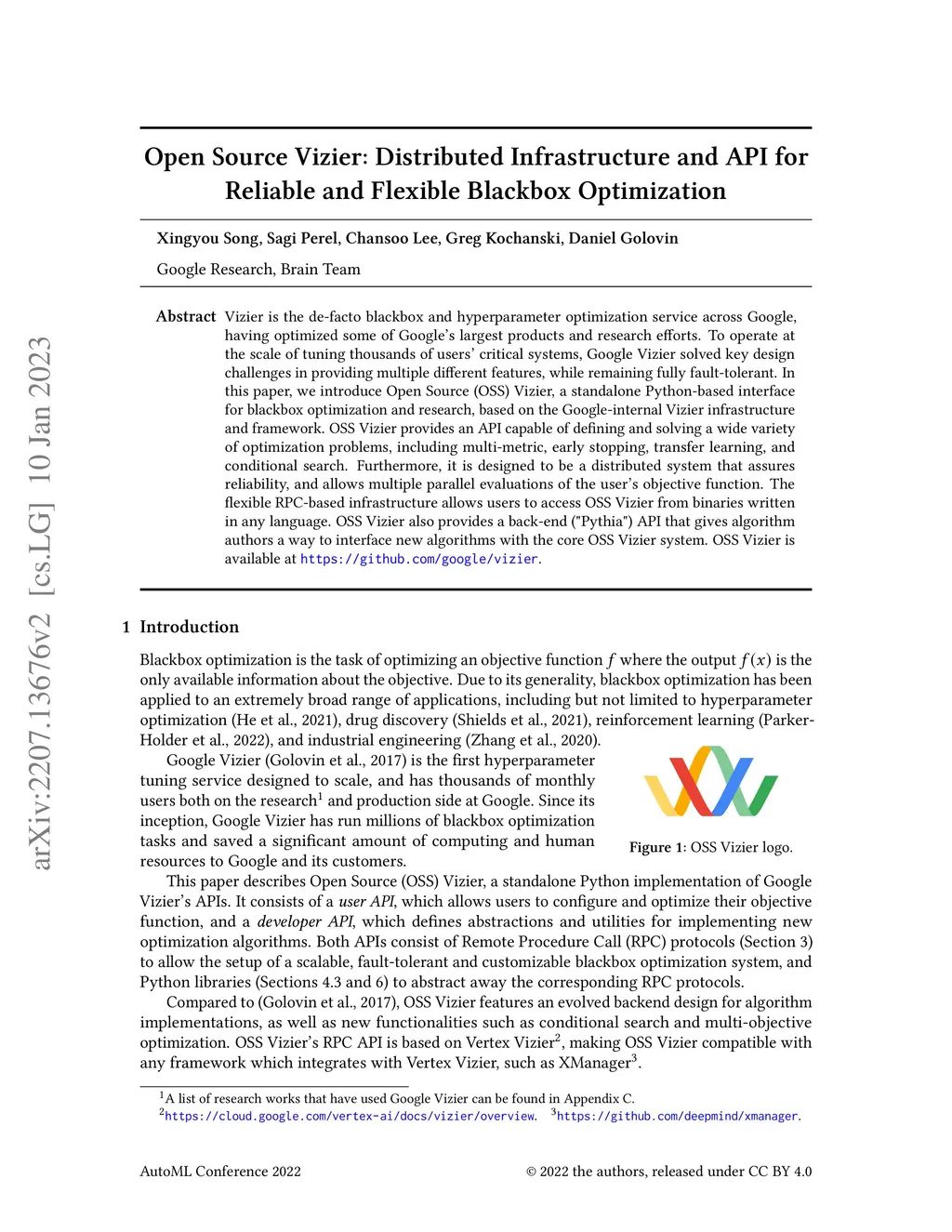 Vizier is the de-facto blackbox and hyperparameter optimization service across Google, having optimized some of Google's largest products and research efforts. To operate at the scale of tuning thousands of users' critical systems, Google Vizier solved key design challenges in providing multiple different features, while remaining fully fault-tolerant. In this paper, we introduce Open Source (OSS) Vizier, a standalone Python-based interface for blackbox optimization and research, based on the Google-internal Vizier infrastructure and framework. OSS Vizier provides an API capable of defining and solving a wide variety of optimization problems, including multi-metric, early stopping, transfer learning, and conditional search. Furthermore, it is designed to be a distributed system that assures reliability, and allows multiple parallel evaluations of the user's objective function. The flexible RPC-based infrastructure allows users to access OSS Vizier from binaries written in any language. OSS Vizier also provides a back-end ("Pythia") API that gives algorithm authors a way to interface new algorithms with the core OSS Vizier system. OSS Vizier is available at https://github.com/google/vizier.