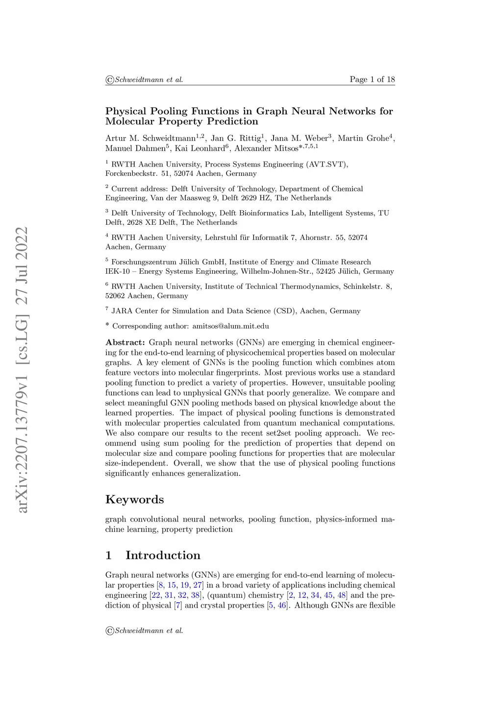 Graph neural networks (GNNs) are emerging in chemical engineering for the end-to-end learning of physicochemical properties based on molecular graphs. A key element of GNNs is the pooling function which combines atom feature vectors into molecular fingerprints. Most previous works use a standard pooling function to predict a variety of properties. However, unsuitable pooling functions can lead to unphysical GNNs that poorly generalize. We compare and select meaningful GNN pooling methods based on physical knowledge about the learned properties. The impact of physical pooling functions is demonstrated with molecular properties calculated from quantum mechanical computations. We also compare our results to the recent set2set pooling approach. We recommend using sum pooling for the prediction of properties that depend on molecular size and compare pooling functions for properties that are molecular size-independent. Overall, we show that the use of physical pooling functions significantly enhances generalization.