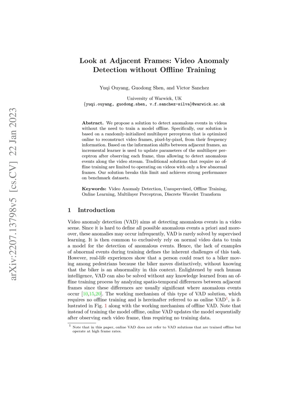 Look at Adjacent Frames: Video Anomaly Detection without Offline