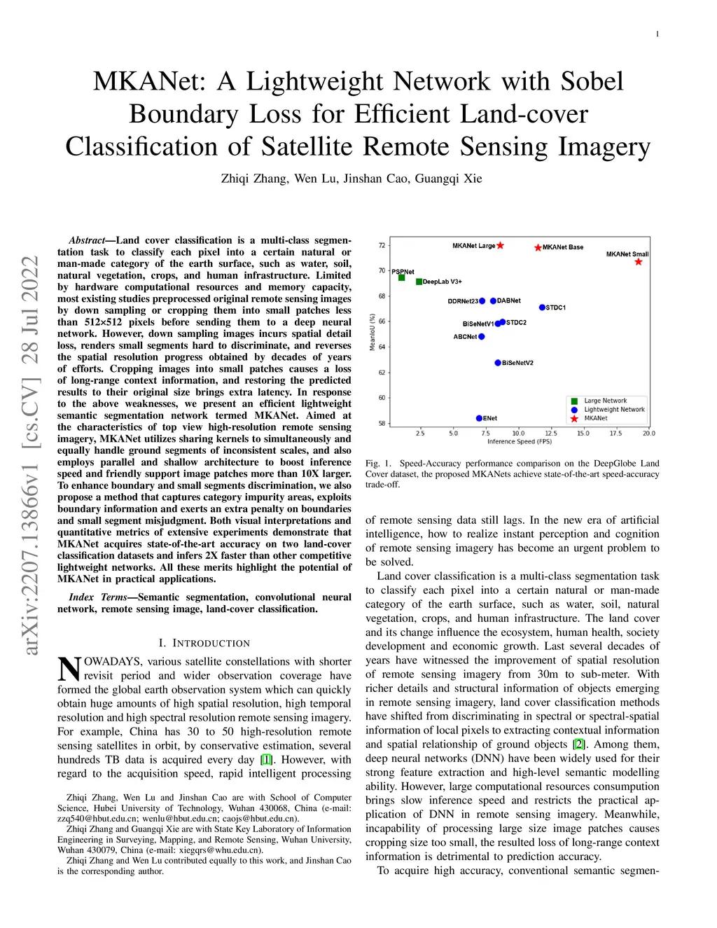 Land cover classification is a multi-class segmentation task to classify each pixel into a certain natural or man-made category of the earth surface, such as water, soil, natural vegetation, crops, and human infrastructure. Limited by hardware computational resources and memory capacity, most existing studies preprocessed original remote sensing images by down sampling or cropping them into small patches less than 512*512 pixels before sending them to a deep neural network. However, down sampling images incurs spatial detail loss, renders small segments hard to discriminate, and reverses the spatial resolution progress obtained by decades of years of efforts. Cropping images into small patches causes a loss of long-range context information, and restoring the predicted results to their original size brings extra latency. In response to the above weaknesses, we present an efficient lightweight semantic segmentation network termed MKANet. Aimed at the characteristics of top view high-resolution remote sensing imagery, MKANet utilizes sharing kernels to simultaneously and equally handle ground segments of inconsistent scales, and also employs parallel and shallow architecture to boost inference speed and friendly support image patches more than 10X larger. To enhance boundary and small segments discrimination, we also propose a method that captures category impurity areas, exploits boundary information and exerts an extra penalty on boundaries and small segment misjudgment. Both visual interpretations and quantitative metrics of extensive experiments demonstrate that MKANet acquires state-of-the-art accuracy on two land-cover classification datasets and infers 2X faster than other competitive lightweight networks. All these merits highlight the potential of MKANet in practical applications.