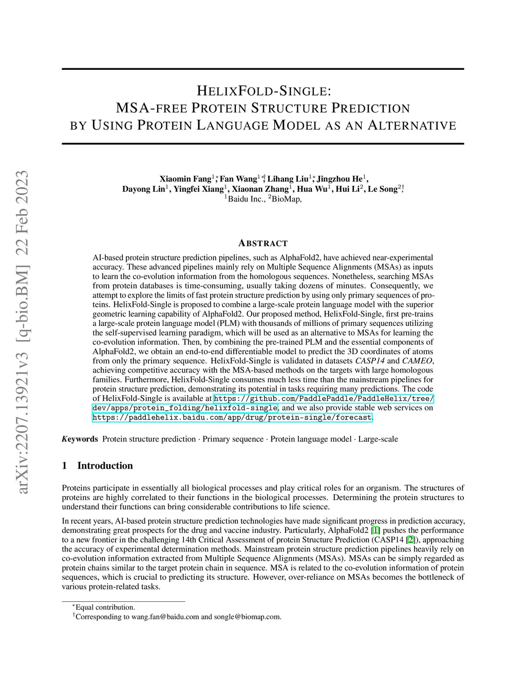 HelixFold-Single: MSA-free Protein Structure Prediction by Using Protein