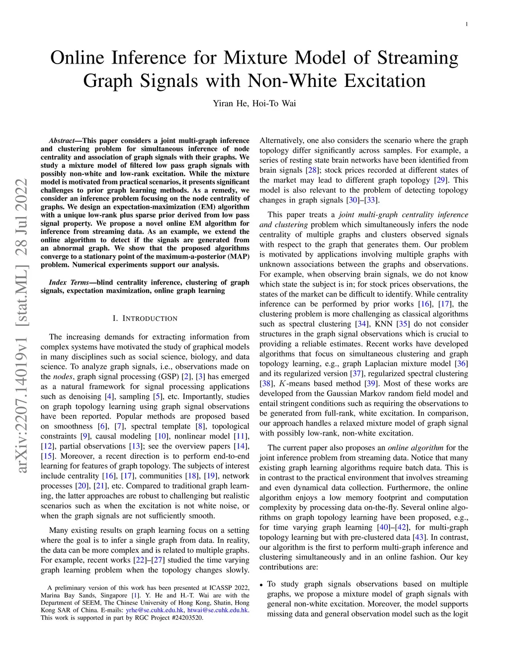 This paper considers a joint multi-graph inference and clustering problem for simultaneous inference of node centrality and association of graph signals with their graphs. We study a mixture model of filtered low pass graph signals with possibly non-white and low-rank excitation. While the mixture model is motivated from practical scenarios, it presents significant challenges to prior graph learning methods. As a remedy, we consider an inference problem focusing on the node centrality of graphs. We design an expectation-maximization (EM) algorithm with a unique low-rank plus sparse prior derived from low pass signal property. We propose a novel online EM algorithm for inference from streaming data. As an example, we extend the online algorithm to detect if the signals are generated from an abnormal graph. We show that the proposed algorithms converge to a stationary point of the maximum-a-posterior (MAP) problem. Numerical experiments support our analysis.