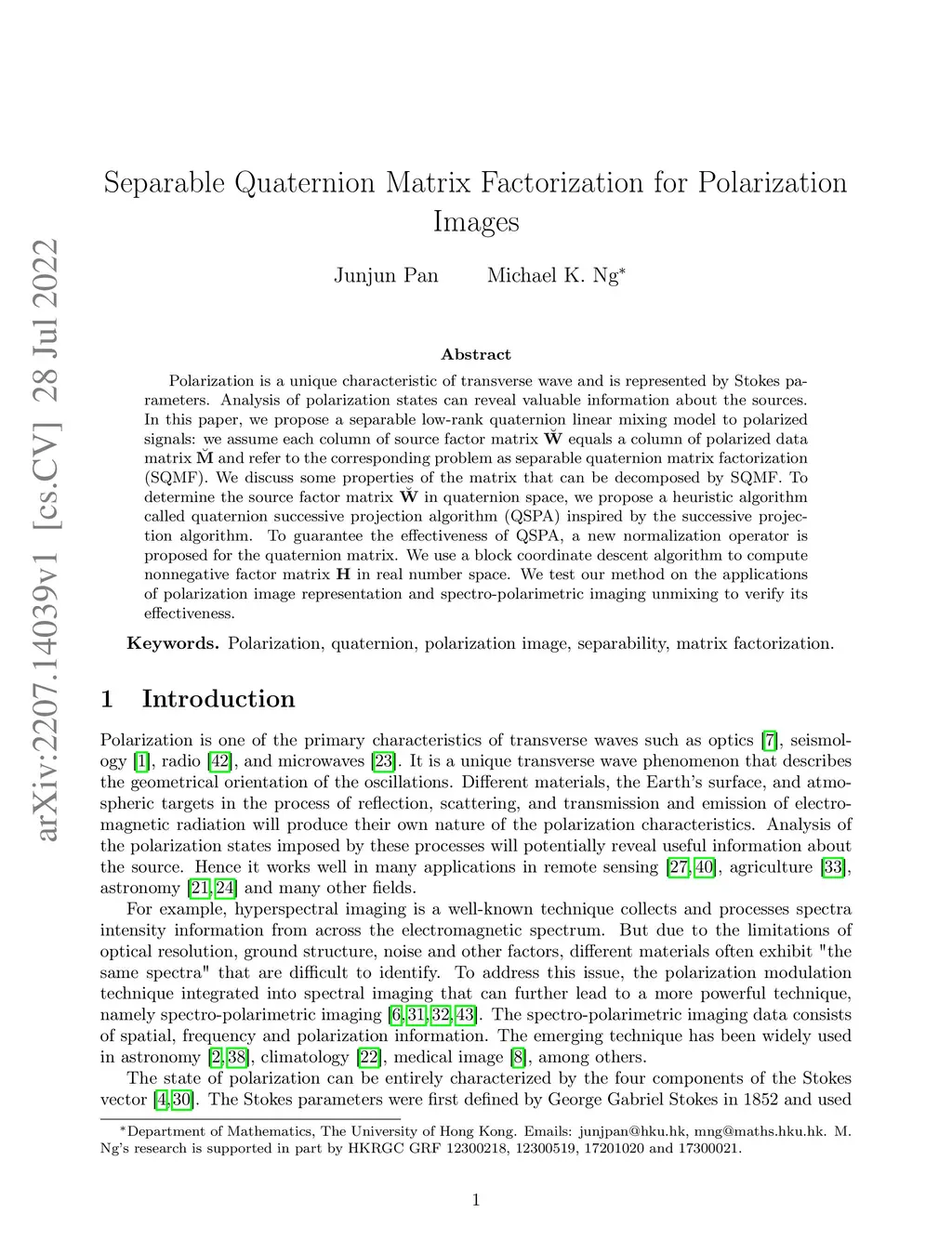 Polarization is a unique characteristic of transverse wave and is represented by Stokes parameters. Analysis of polarization states can reveal valuable information about the sources. In this paper, we propose a separable low-rank quaternion linear mixing model to polarized signals: we assume each column of the source factor matrix equals a column of polarized data matrix and refer to the corresponding problem as separable quaternion matrix factorization (SQMF). We discuss some properties of the matrix that can be decomposed by SQMF. To determine the source factor matrix in quaternion space, we propose a heuristic algorithm called quaternion successive projection algorithm (QSPA) inspired by the successive projection algorithm. To guarantee the effectiveness of QSPA, a new normalization operator is proposed for the quaternion matrix. We use a block coordinate descent algorithm to compute nonnegative factor activation matrix in real number space. We test our method on the applications of polarization image representation and spectro-polarimetric imaging unmixing to verify its effectiveness.