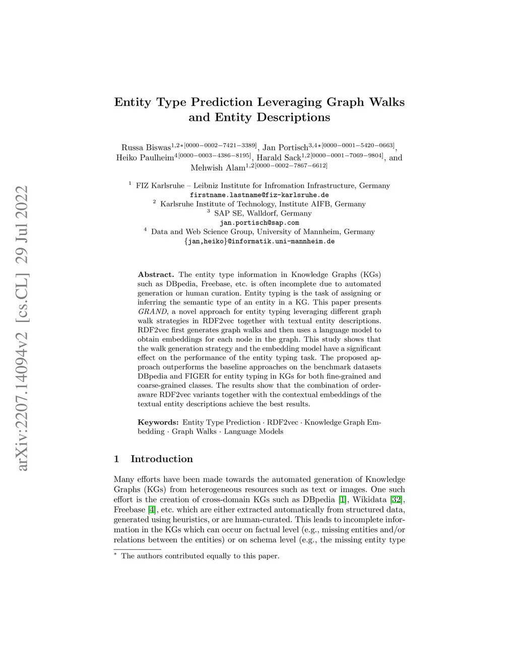 The entity type information in Knowledge Graphs (KGs) such as DBpedia, Freebase, etc. is often incomplete due to automated generation or human curation. Entity typing is the task of assigning or inferring the semantic type of an entity in a KG. This paper presents \textit{GRAND}, a novel approach for entity typing leveraging different graph walk strategies in RDF2vec together with textual entity descriptions. RDF2vec first generates graph walks and then uses a language model to obtain embeddings for each node in the graph. This study shows that the walk generation strategy and the embedding model have a significant effect on the performance of the entity typing task. The proposed approach outperforms the baseline approaches on the benchmark datasets DBpedia and FIGER for entity typing in KGs for both fine-grained and coarse-grained classes. The results show that the combination of order-aware RDF2vec variants together with the contextual embeddings of the textual entity descriptions achieve the best results.