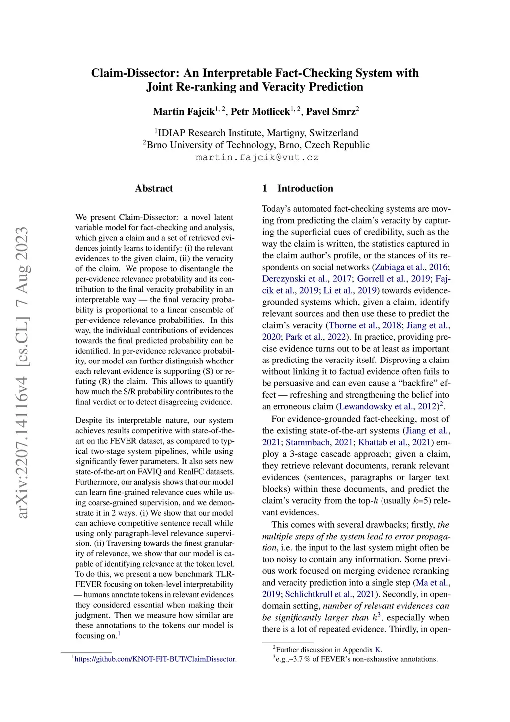 Claim-Dissector: An Interpretable Fact-Checking System with Joint Re-ranking and Veracity Prediction