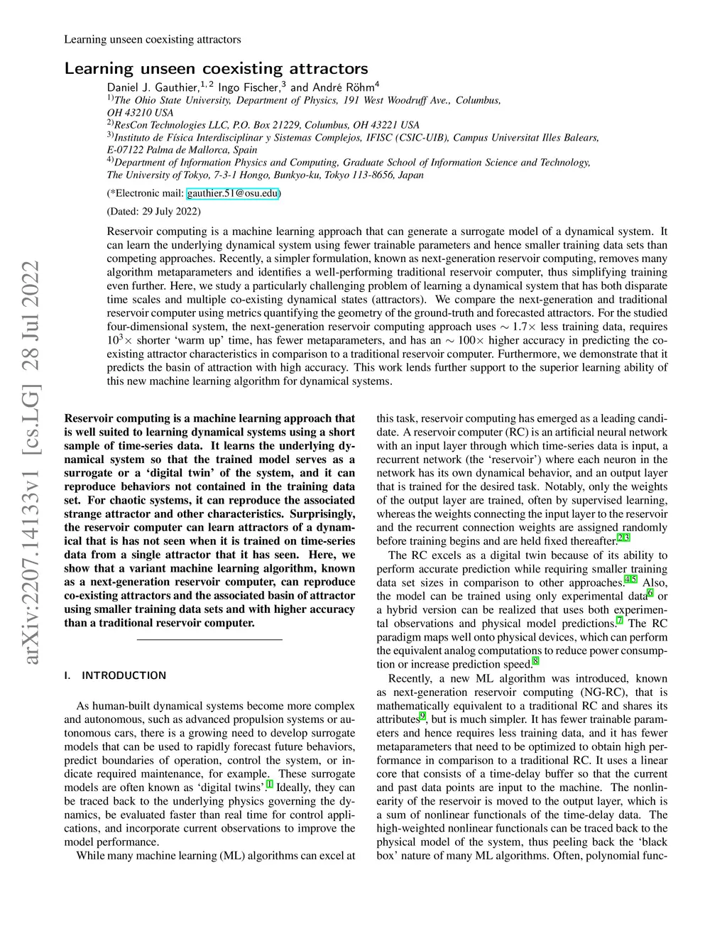 Reservoir computing is a machine learning approach that can generate a surrogate model of a dynamical system. It can learn the underlying dynamical system using fewer trainable parameters and hence smaller training data sets than competing approaches. Recently, a simpler formulation, known as next-generation reservoir computing, removes many algorithm metaparameters and identifies a well-performing traditional reservoir computer, thus simplifying training even further. Here, we study a particularly challenging problem of learning a dynamical system that has both disparate time scales and multiple co-existing dynamical states (attractors). We compare the next-generation and traditional reservoir computer using metrics quantifying the geometry of the ground-truth and forecasted attractors. For the studied four-dimensional system, the next-generation reservoir computing approach uses less training data, requires shorter `warm up' time, has fewer metaparameters, and has an higher accuracy in predicting the co-existing attractor characteristics in comparison to a traditional reservoir computer. Furthermore, we demonstrate that it predicts the basin of attraction with high accuracy. This work lends further support to the superior learning ability of this new machine learning algorithm for dynamical systems.