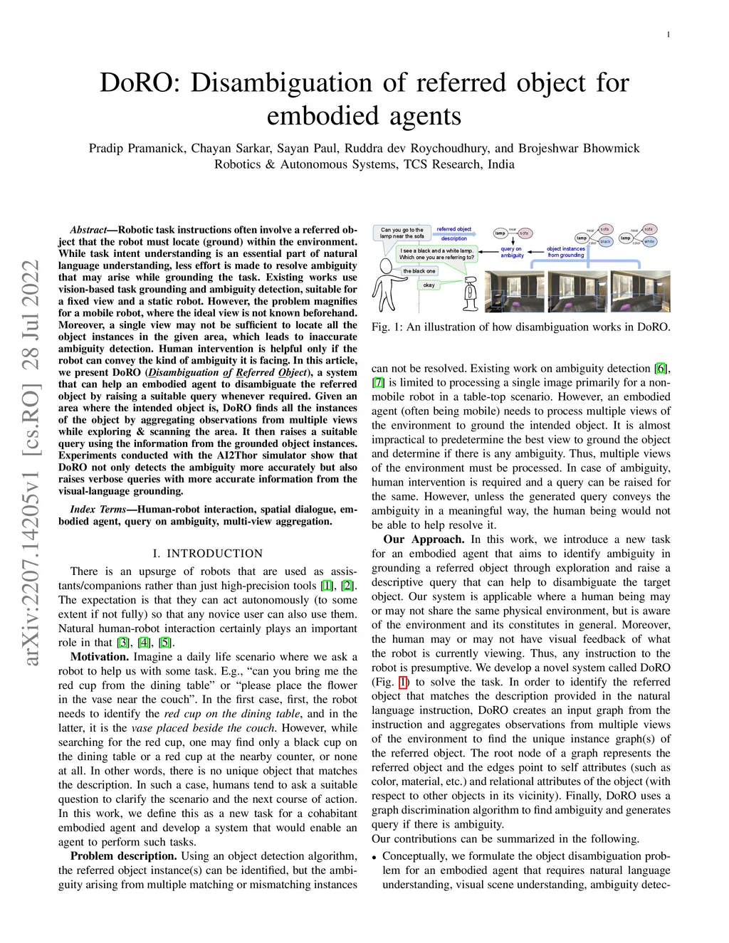 Robotic task instructions often involve a referred object that the robot must locate (ground) within the environment. While task intent understanding is an essential part of natural language understanding, less effort is made to resolve ambiguity that may arise while grounding the task. Existing works use vision-based task grounding and ambiguity detection, suitable for a fixed view and a static robot. However, the problem magnifies for a mobile robot, where the ideal view is not known beforehand. Moreover, a single view may not be sufficient to locate all the object instances in the given area, which leads to inaccurate ambiguity detection. Human intervention is helpful only if the robot can convey the kind of ambiguity it is facing. In this article, we present DoRO (Disambiguation of Referred Object), a system that can help an embodied agent to disambiguate the referred object by raising a suitable query whenever required. Given an area where the intended object is, DoRO finds all the instances of the object by aggregating observations from multiple views while exploring & scanning the area. It then raises a suitable query using the information from the grounded object instances. Experiments conducted with the AI2Thor simulator show that DoRO not only detects the ambiguity more accurately but also raises verbose queries with more accurate information from the visual-language grounding.