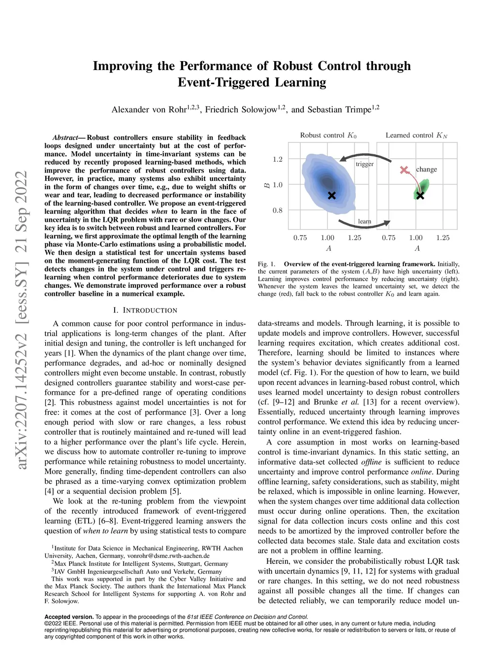 Robust controllers ensure stability in feedback loops designed under uncertainty but at the cost of performance. Model uncertainty in time-invariant systems can be reduced by recently proposed learning-based methods, thus improving the performance of robust controllers using data. However, in practice, many systems also exhibit uncertainty in the form of changes over time, e.g., due to weight shifts or wear and tear, leading to decreased performance or instability of the learning-based controller. We propose an event-triggered learning algorithm that decides when to learn in the face of uncertainty in the LQR problem with rare or slow changes. Our key idea is to switch between robust and learned controllers. For learning, we first approximate the optimal length of the learning phase via Monte-Carlo estimations using a probabilistic model. We then design a statistical test for uncertain systems based on the moment-generating function of the LQR cost. The test detects changes in the system under control and triggers re-learning when control performance deteriorates due to system changes. We demonstrate improved performance over a robust controller baseline in a numerical example.